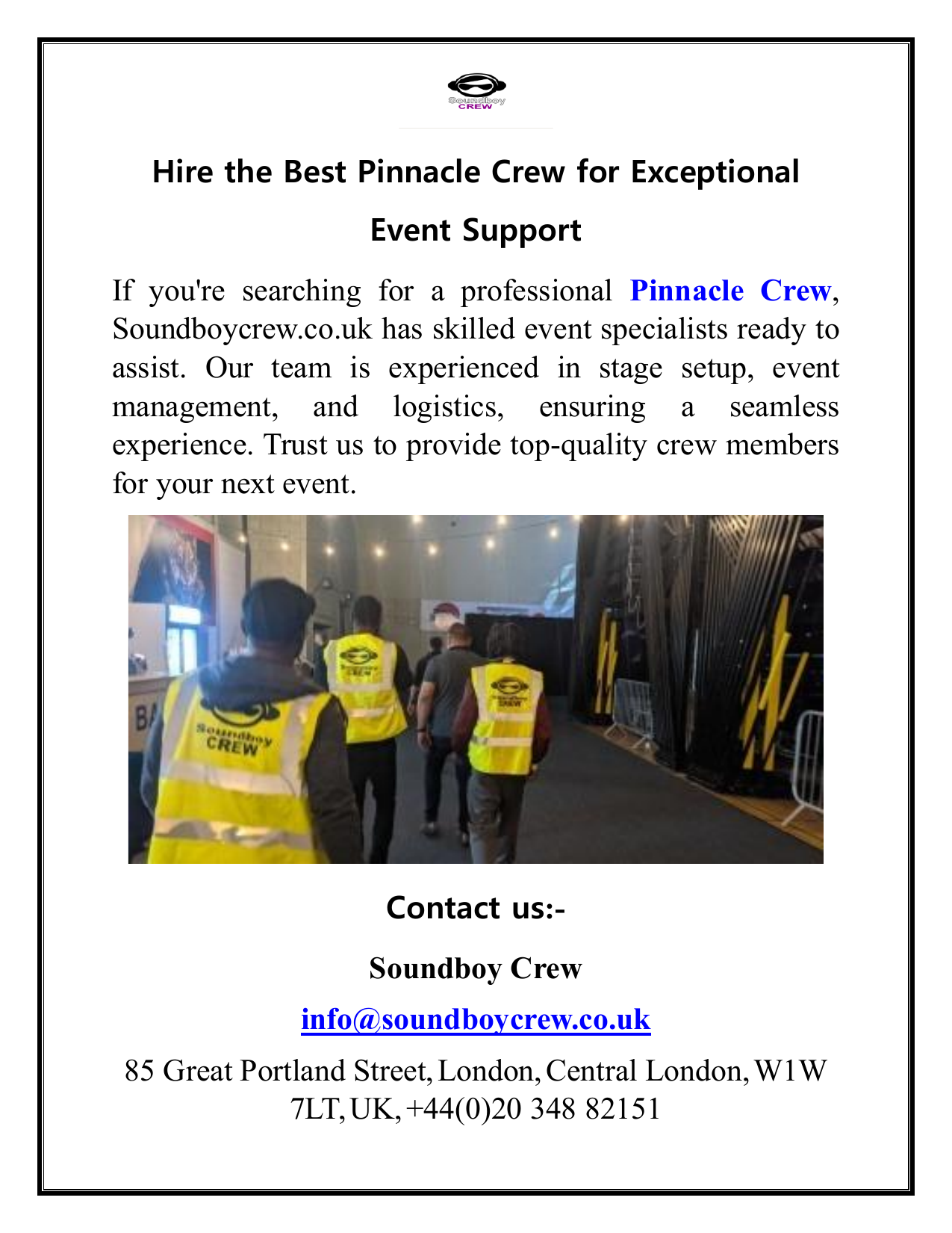 Hire the Best Pinnacle Crew for Exceptional Event Support If you're searching for a professional Pinnacle Crew, Soundboycrew.co.uk has skilled event specialists ready to assist. Our team is experienced in stage setup, event management, and logistics, ensuring a seamless experience. Trust us to provide top-quality crew members for your next event. Contact us:Soundboy Crew [email protected] 85 Great Portland Street, London, Central London, W1W 7LT, UK, +44(0)20 348 82151