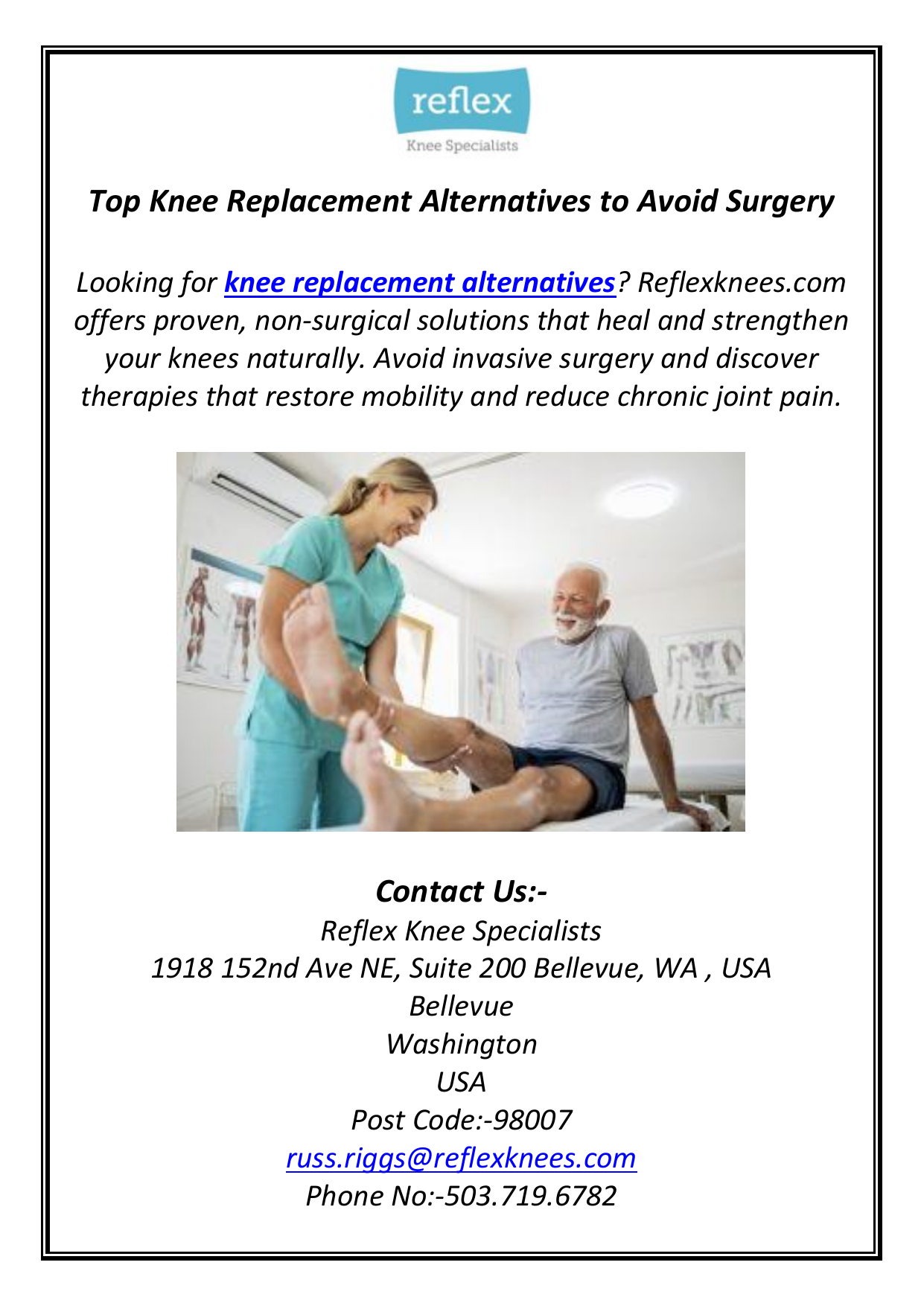 Top Knee Replacement Alternatives to Avoid Surgery Looking for knee replacement alternatives? Reflexknees.com offers proven, non-surgical solutions that heal and strengthen your knees naturally. Avoid invasive surgery and discover therapies that restore mobility and reduce chronic joint pain. Contact Us:- Reflex Knee Specialists 1918 152nd Ave NE, Suite 200 Bellevue, WA , USA Bellevue Washington USA Post Code:-98007 [email protected] Phone No:-503.719.6782