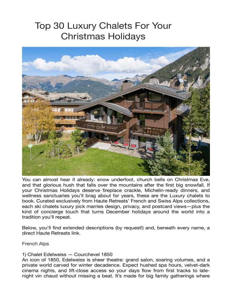 Top 30 Luxury Chalets For Your Christmas Holidays You can almost hear it already: snow underfoot, church bells on Christmas Eve, and that glorious hush that falls over the mountains after the rst big snowfall. If your Christmas Holidays deserve replace crackle, Michelin-ready dinners, and wellness sanctuaries you’ll brag about for years, these are the Luxury chalets to book. Curated exclusively from Haute Retreats’ French and Swiss Alps collections, each ski chalets luxury pick marries design, privacy, and postcard views—plus the kind of concierge touch that turns December holidays around the world into a tradition you’ll repeat. Below, you’ll nd extended descriptions (by request!) and, beneath every name, a direct Haute Retreats link. French Alps fi fi fl fi fi 1) Chalet Edelweiss — Courchevel 1850 An icon of 1850, Edelweiss is sheer theatre: grand salon, soaring volumes, and a private world carved for winter decadence. Expect hushed spa hours, velvet-dark cinema nights, and lift-close access so your days ow from rst tracks to latenight vin chaud without missing a beat. It’s made for big family gatherings where 2) Chalet Ascension — Méribel Méribel’s timber-and-stone soul wrapped in modern polish. Ascension layers convivial living spaces with private, cocoon-like suites, so you’re all together when you want it—and blissfully quiet when you don’t. After a day weaving the Three Valleys, warm up in the wellness area before a chef-led dinner that drifts long into candlelit conversation. click here to know more 3) Chalet Altius — Méribel Altius sits like a discreet VIP pass to the best of Méribel: quick slope access, cinematic mountain frames in the windows, and a lounge designed for languid afternoons. It’s a chalet that balances heritage textures with sleek comforts—think reside aperitifs, a steam session, and then back to the glow of the dining table. click here to know more fi fl 4) Chalet Abade — Tignes Purpose-built for serious skiers and serious relaxing, Abade gets you up early and home happy. The rooms feel like a hush—soft throws, alpine timber, mountain light —while the spa answers every post-slope need. Gather by the replace while your private chef plates up Savoyard classics with modern air. click here to know more fi fi grandparents linger by the re and children race down corridors in their socks. click here to know more 5) Chalet 1855 — Val d’Isère Old-wood romance meets contemporary ease. Chalet 1855 is the family favorite where grandparents claim the library nook and kids call dibs on the cinema. Wake to fresh croissants, ski Val’s legendary terrain, then return for a hammam and a leisurely dinner. click here to know more 6) Chalet Mont Tremblant — Méribel Grand, graceful, and designed for entertaining, Mont Tremblant feels like a private members’ club that happens to be a chalet. Expect sun-splashed terraces by day, candlelit pool re ections by night, and an après ow that moves seamlessly from spa to bar to reside. click here to know more ff fl fl fi 7) Etoile du Nord — West Wing — Val d’Isère A sleek, sculptural retreat tucked into the village fabric, the West Wing pairs wowfactor architecture with comfort you feel the moment boots come o . It’s the cocoon you want for Christmas week: views, volume, and a private wellness rhythm that resets you each evening. click here to know more 8) Etoile du Nord — East Wing — Val d’Isère Sister to the West, the East Wing turns up the intimacy—more of that hushed, gallery-like feel and a layout that suits families or two-house parties traveling together. Glide back from the slopes, sink into the spa, then linger around the long table as the snow thickens outside. click here to know more 9) Domaine de l’Orme — Val d’Isère A contemporary Alpine estate with the space to breathe. Think double-height living, designer lines softened by warm woods, and a wellness level that becomes your nightly ritual. Morning espresso facing white-peaked horizons; evenings by the crackling re. click here to know more fi 10) Chalet Gentianes — Courchevel 1850 Courchevel royalty: ski-in/ski-out (snow permitting) and as private as it is polished. Gentianes is set up for seamless days—out the door, onto the slopes, and back to spa time and chef-led dinners. Classic Alpine bones, modern glamour, and a location you’ll measure all future chalets against. click here to know more 12) Chalet Perce Neige — Courchevel 1850 The dream sequence: step o the Bellecôte, step into your private spa. Perce Neige is all about ease—elevator convenience, tailored menus, and living spaces meant for togetherness. It’s a polished Alpine refuge with just the right dose of drama. click here to know more 13) Chalet Pèle — Courchevel 1850 Intimate and beautifully placed, Pèle suits families who value privacy and proximity in equal measure. Mornings begin with fresh pastries and views; afternoons conclude with a sauna or a glass by the hearth while dinner perfumes the air. click here to know more ff fi Chalet Gentianes | Courchevel 1850 Chalets | Haute Retreats 11) La Grande Roche — Courchevel 1850 A hillside statement with big-sky views and big-hearted interiors. La Grande Roche opens onto terraces for winter sunshine and gathers everyone again around the replace after dusk. The service is quietly exacting—your plans, perfectly handled, so the only decision is another glass or an early night. click here to know more 14) Chalet Razzie — Courchevel 1850 Classic 1850 energy—steps from the action yet wrapped in a quiet, luxe shell. Razzie’s contemporary interiors set the scene for long Christmas lunches, board games by the re, and a nightcap under a star-packed winter sky. click here to know more 15) Chalet Vizelle (Vizzelle) — Courchevel 1850 A grand, light- lled residence above the Bellecôte with generous suites and a sauna-and-playroom combo that keeps everyone happy. It’s as social