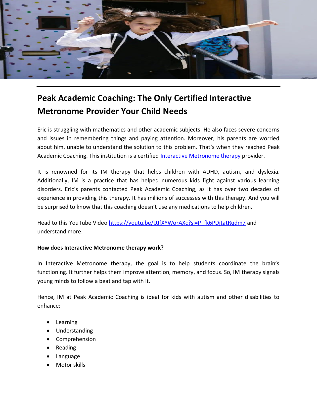 Peak Academic Coaching: The Only Certified Interactive Metronome Provider Your Child Needs Eric is struggling with mathematics and other academic subjects. He also faces severe concerns and issues in remembering things and paying attention. Moreover, his parents are worried about him, unable to understand the solution to this problem. That’s when they reached Peak Academic Coaching. This institution is a certified Interactive Metronome therapy provider. It is renowned for its IM therapy that helps children with ADHD, autism, and dyslexia. Additionally, IM is a practice that has helped numerous kids fight against various learning disorders. Eric’s parents contacted Peak Academic Coaching, as it has over two decades of experience in providing this therapy. It has millions of successes with this therapy. And you will be surprised to know that this coaching doesn’t use any medications to help children. Head to this YouTube Video https://youtu.be/UJfXYWorAXc?si=P_fk6PDjtatRqdm7 and understand more. How does Interactive Metronome therapy work? In Interactive Metronome therapy, the goal is to help students coordinate the brain’s functioning. It further helps them improve attention, memory, and focus. So, IM therapy signals young minds to follow a beat and tap with it. Hence, IM at Peak Academic Coaching is ideal for kids with autism and other disabilities to enhance: Learning Understanding Comprehension Reading Language Motor skills Sensory integration Self-control Emotional-regulation Attention and focus Time management Working memory Organizational skills Balance Posture Coordination Goal setting Study skills The best part is that this program is completely at-home coaching. So, you can also monitor your child’s progress and encourage them to perform. Who is the IM therapy for? The online Interactive Metronome therapy at Peak Academic Coaching is for kids dealing with: ADHD Dyslexia Sensory dysfunction Autism Lack of executive functioning skills Auditory delays Delays in processing information Learning issues Moreover, Peak Academic Coaching has highly experienced and certified coaches to conduct the IM therapy. Besides, your kid feels safe and heard in this environment. You don’t have to worry about their comfort, as coaches are highly interactive and friendly. This coaching destination is the only place for all your child’s needs. You’ll also find its therapy to be engaging and gamified. You’ll be startled to read the reviews on Peak Academic Coaching’s official website. Parents have praised it for the amazing results of IM therapy and executive function skills coaching. They have also added that their kids are scoring better in academics with higher concentration levels. To get more details, visit https://peakacademiccoaching.com/ Contact: (800) 710-5242 Original Source: https://bit.ly/4loC3z5