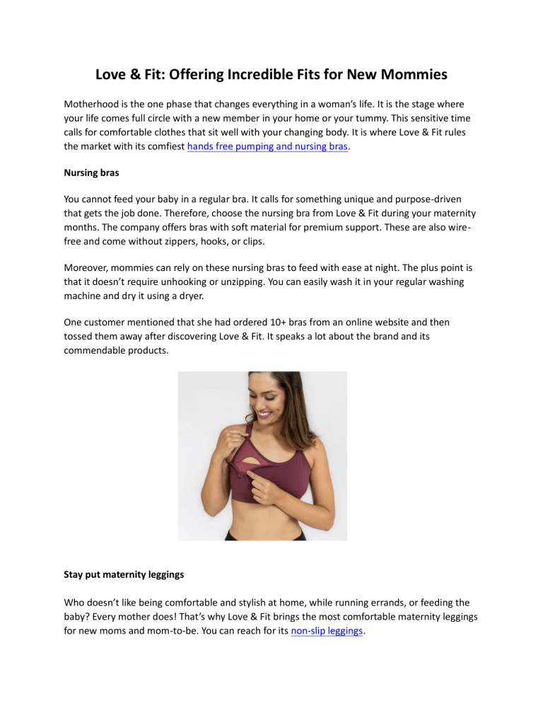 Love & Fit: Offering Incredible Fits for New Mommies Motherhood is the one phase that changes everything in a woman’s life. It is the stage where your life comes full circle with a new member in your home or your tummy. This sensitive time calls for comfortable clothes that sit well with your changing body. It is where Love & Fit rules the market with its comfiest hands free pumping and nursing bras. Nursing bras You cannot feed your baby in a regular bra. It calls for something unique and purpose-driven that gets the job done. Therefore, choose the nursing bra from Love & Fit during your maternity months. The company offers bras with soft material for premium support. These are also wirefree and come without zippers, hooks, or clips. Moreover, mommies can rely on these nursing bras to feed with ease at night. The plus point is that it doesn’t require unhooking or unzipping. You can easily wash it in your regular washing machine and dry it using a dryer. One customer mentioned that she had ordered 10+ bras from an online website and then tossed them away after discovering Love & Fit. It speaks a lot about the brand and its commendable products. Stay put maternity leggings Who doesn’t like being comfortable and stylish at home, while running errands, or feeding the baby? Every mother does! That’s why Love & Fit brings the most comfortable maternity leggings for new moms and mom-to-be. You can reach for its non-slip leggings. Moreover, many women consistently praise the seamless fabrics of these leggings. They also mention that these maternity leggings do not fit or hug their body awkwardly. She also praised the fit of the leggings as they shape the back effortlessly. You can never go wrong with Love & Fit. It has to be the best brand out there for some fantastic, breathable leggings and bras. What makes Love & Fit’s leggings worth every penny is the silicone grip that keeps your leggings from slipping on the belly region. As a result, they don’t slip away or cause any mishappenings. You can order your leggings or postpartum activewear on the official website. The best part is that they frequently run discounts and offer coupons. Hence, you cannot miss this opportunity to collect clothing from Love & Fit for the year. You will not regret making this investment and will undoubtedly come back for repurchasing. Trust this brand and never rely on cheap alternatives again. To get more details, visit https://www.loveandfit.com/ Original Source: https://bit.ly/4m8oRzA