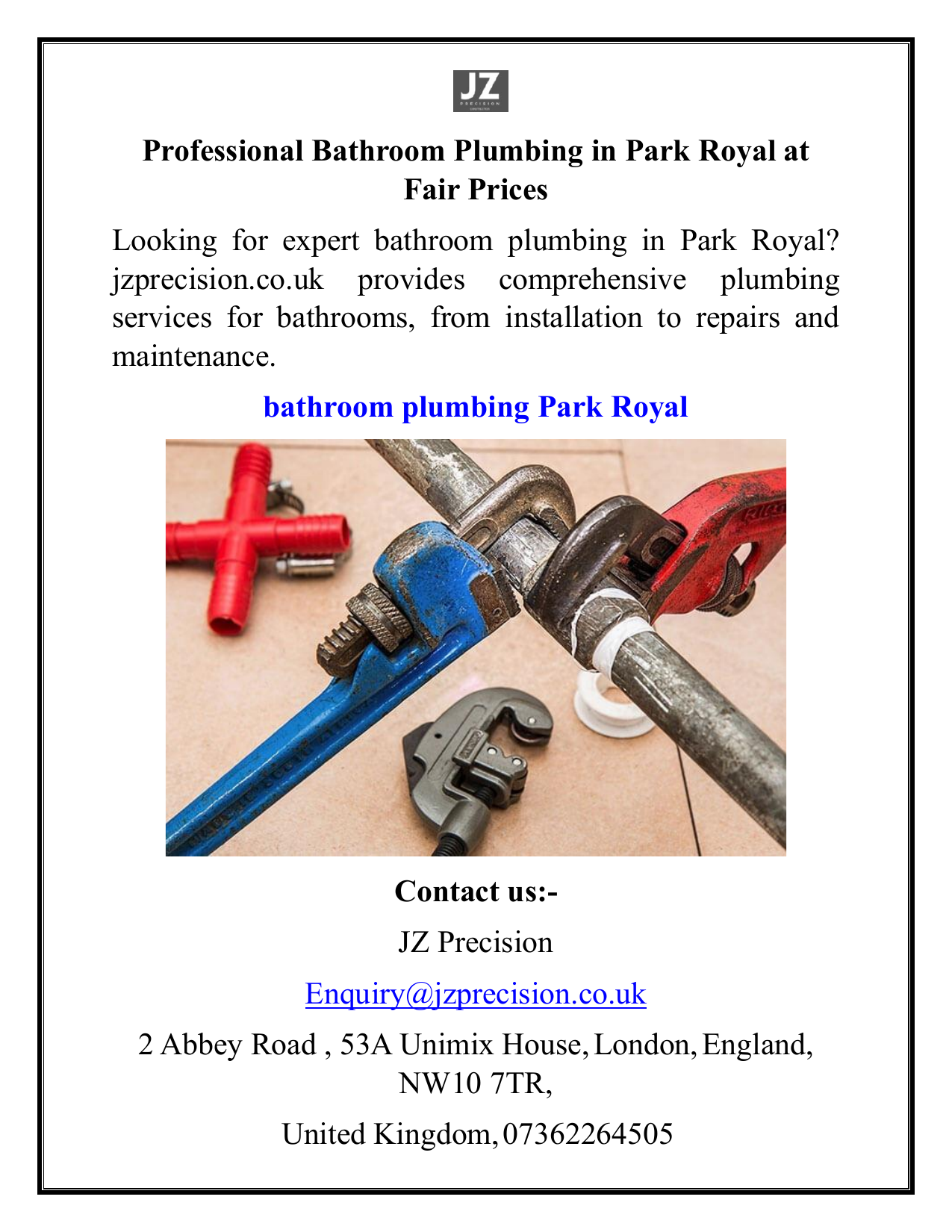 Professional Bathroom Plumbing in Park Royal at Fair Prices Looking for expert bathroom plumbing in Park Royal? jzprecision.co.uk provides comprehensive plumbing services for bathrooms, from installation to repairs and maintenance. bathroom plumbing Park Royal Contact us:JZ Precision [email protected] 2 Abbey Road , 53A Unimix House, London, England, NW10 7TR, United Kingdom, 07362264505
