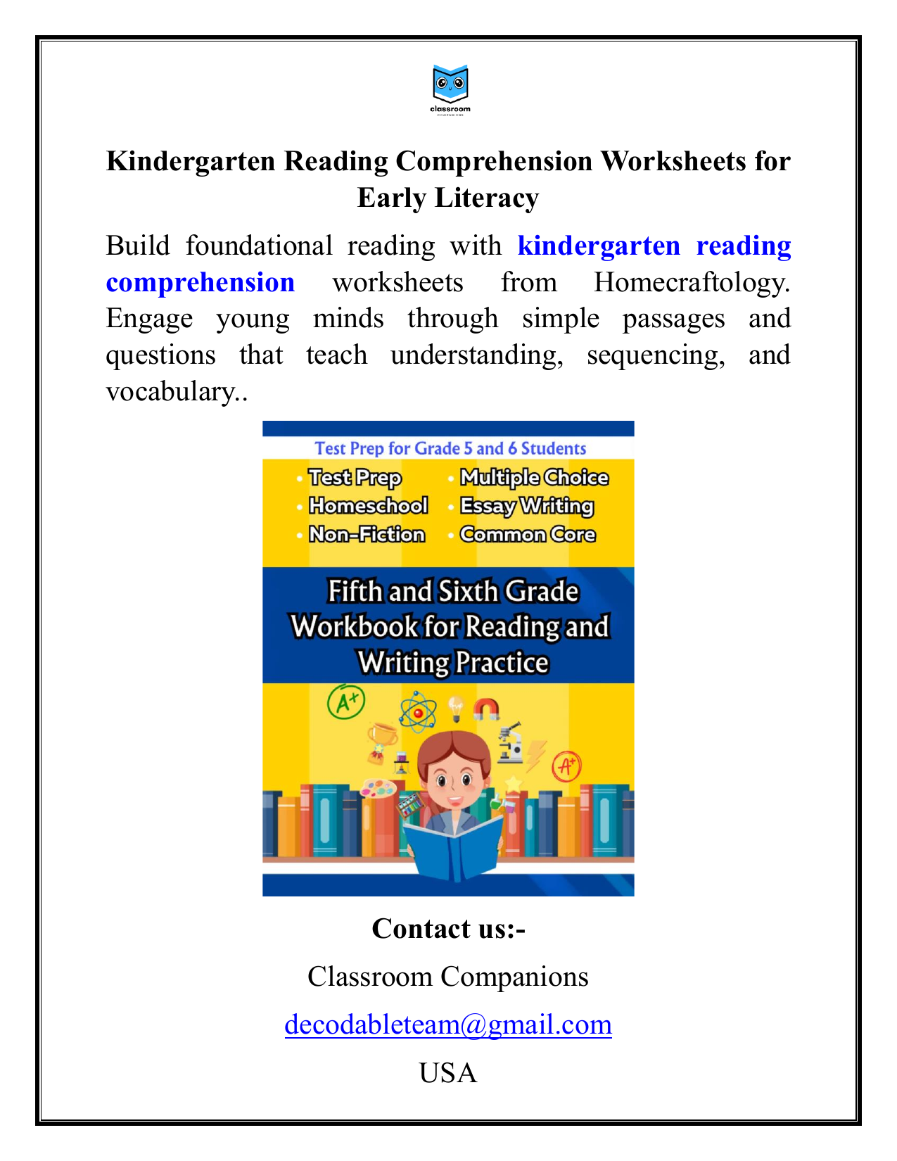 Kindergarten Reading Comprehension Worksheets for Early Literacy Build foundational reading with kindergarten reading comprehension worksheets from Homecraftology. Engage young minds through simple passages and questions that teach understanding, sequencing, and vocabulary.. Contact us:Classroom Companions [email protected] USA