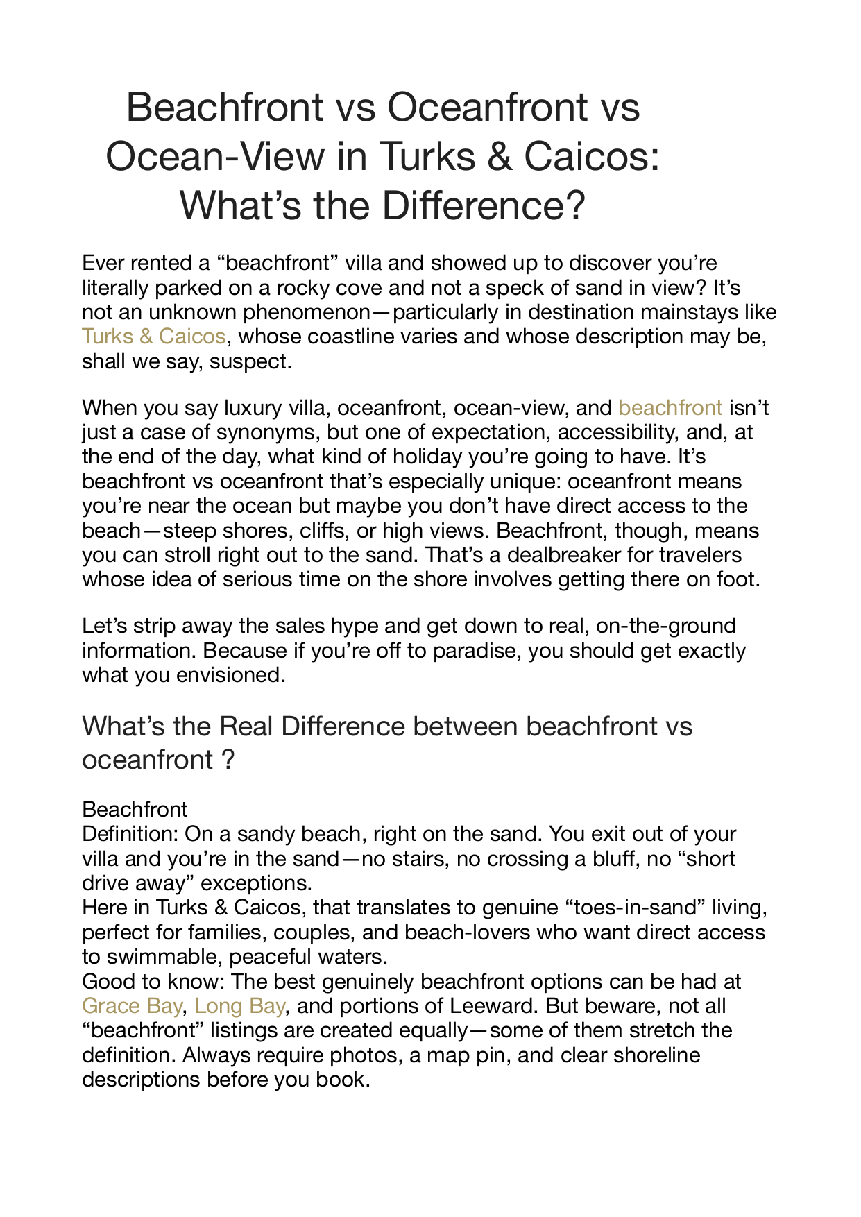 Beachfront vs Oceanfront vs Ocean-View in Turks & Caicos: What’s the Di erence? Ever rented a “beachfront” villa and showed up to discover you’re literally parked on a rocky cove and not a speck of sand in view? It’s not an unknown phenomenon—particularly in destination mainstays like Turks & Caicos, whose coastline varies and whose description may be, shall we say, suspect. When you say luxury villa, oceanfront, ocean-view, and beachfront isn’t just a case of synonyms, but one of expectation, accessibility, and, at the end of the day, what kind of holiday you’re going to have. It’s beachfront vs oceanfront that’s especially unique: oceanfront means you’re near the ocean but maybe you don’t have direct access to the beach—steep shores, cli s, or high views. Beachfront, though, means you can stroll right out to the sand. That’s a dealbreaker for travelers whose idea of serious time on the shore involves getting there on foot. Let’s strip away the sales hype and get down to real, on-the-ground information. Because if you’re o to paradise, you should get exactly what you envisioned. What’s the Real Di erence between beachfront vs oceanfront ? ff ff ff ff ff fi fi Beachfront De nition: On a sandy beach, right on the sand. You exit out of your villa and you’re in the sand—no stairs, no crossing a blu , no “short drive away” exceptions. Here in Turks & Caicos, that translates to genuine “toes-in-sand” living, perfect for families, couples, and beach-lovers who want direct access to swimmable, peaceful waters. Good to know: The best genuinely beachfront options can be had at Grace Bay, Long Bay, and portions of Leeward. But beware, not all “beachfront” listings are created equally—some of them stretch the de nition. Always require photos, a map pin, and clear shoreline descriptions before you book. ff ff fi ff Oceanfront De nition: Located right on the ocean but not always with direct access to sandy beaches. Frequently situated over rocky shores, coral shelves, or on blu s. At Turks & Caicos, some of the estates at Turtle Tail or on blu -tops o er oceanfront, which encompasses views out to horizon, privacy, and dramatic styling—though nonswimable water out front. Good to know: These properties are often visually stunning and great for design lovers or those looking for a quiet, elevated escape. You’ll likely need to drive to nearby beaches for swimming. fi fi Ocean-View De nition: In sight of the ocean, but not on. May be across the street, up a hill, or back from the ocean. Views range—some are broad and unobstructed, some may be limited or only obtainable from speci c rooms. Keep in mind: Properties that face the ocean tend to be less expensive. They have visual allure but possibly limited accessibility to the beach. Make sure to know if the beach is far away and if the view is really unrestricted. Why This Matters in Turks & Caicos Turks & Caicos has a variety of shoreline conditions across its islands, and even just within Providenciales (or “Provo”), the island most travelers stay on. ▪ Grace Bay (North Shore): Known for calm waters, reef protection, ▪ ▪ ff ▪ and soft sand. Ideal for beachfront stays, especially with young children. Long Bay (South Shore): Steady onshore winds and miles of shallow water make this a kiteboarding haven. Also o ers some beachfront villas, but parts of the shore may be narrow or tidal. Turtle Tail (South Shore): Elevated, rocky coastline with breathtaking oceanfront villas. Less swimmable, but highly private and architectural. The Bight & Smith’s Reef: Best walk-in snorkeling on the island, ideal for marine life lovers. Quick Comparison: Oceanfront vs Beachfront vs OceanView Term Direct Sand Access Yes Typical Areas Grace Bay, Long Bay, Leeward Oceanfront Not guaranteed Turtle Tail, blu areas Ocean-view No Inland/ hillside near Grace Bay or Leeward Beachfront Pros Direct access, swimmable, familyPrivacy, dramatic views More a ordable, still scenic Considerati ons Popular beaches may have public foot Rocky water entry, may need to drive to Con rm view and beach access Choosing Based on Travel Style ff fi ff ff For families with small children: Book Beachfront vs oceanfront in Grace Bay or Leeward. The reefprotected waters are calm, shallow, and safe for little ones. You can watch them from the pool deck while sipping your morning co ee. For kiteboarders and water sports lovers: Go for Beachfront in Long Bay. This is the island’s kiteboarding hub thanks to steady side-onshore winds and endless shallow ats. For design enthusiasts and privacy seekers: Choose Oceanfront in Turtle Tail. These villas often come with dramatic cli side architecture and unmatched views. You’ll want a rental car to reach swimming beaches. For snorkelers and marine life enthusiasts: Stay near Smith’s Reef or The Bight. These areas o er the best walk-in snorkeling on Provo. Some homes are beachfront, others are a short walk away. The Truth About “Private Beaches” in TCI Turks & Caicos law makes all beaches public up to the high-tide line. That means even in front of luxury homes, people can walk or paddle by. However, access to the beach across private property is not public. So you must use designated public paths unless your villa has its own direct access. fl ff ff This is why some beachfront villas feel more secluded than others—it depends on how remote the beach is, not whether the sand is private. Seasonal Considerations ▪ Wind: Long Bay is breezy almost year-round, perfect for ▪ ▪ kiteboarding but possibly less relaxing for those looking for still air. Swell: Grace Bay is protected by a barrier reef and generally calmer, with gentler waves. Seaweed (Sargassum): It’s seasonal and can vary by shoreline. Haute Retreats concierge sta monitors conditions and will advise you on the best beaches for your stay. Essential Pre-Booking Questions Before you book a villa in Turks & Caicos, ask these: ff 