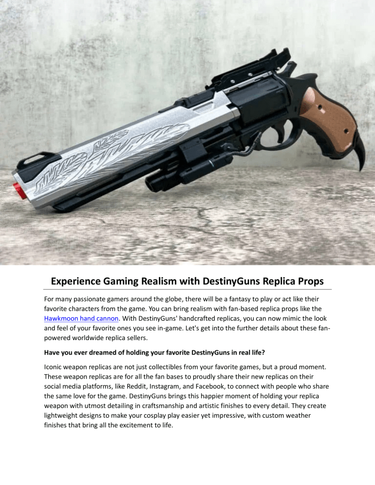 Experience Gaming Realism with DestinyGuns Replica Props For many passionate gamers around the globe, there will be a fantasy to play or act like their favorite characters from the game. You can bring realism with fan-based replica props like the Hawkmoon hand cannon. With DestinyGuns' handcrafted replicas, you can now mimic the look and feel of your favorite ones you see in-game. Let's get into the further details about these fanpowered worldwide replica sellers. Have you ever dreamed of holding your favorite DestinyGuns in real life? Iconic weapon replicas are not just collectibles from your favorite games, but a proud moment. These weapon replicas are for all the fan bases to proudly share their new replicas on their social media platforms, like Reddit, Instagram, and Facebook, to connect with people who share the same love for the game. DestinyGuns brings this happier moment of holding your replica weapon with utmost detailing in craftsmanship and artistic finishes to every detail. They create lightweight designs to make your cosplay play easier yet impressive, with custom weather finishes that bring all the excitement to life. Why did DestinyGuns gain so much popularity in producing replicas? There are many mass-market collectibles with 3D prints all around the world. But what makes DestinyGuns stand out among them? You can find answers on Reddit, explaining why there is so much love for DestinyGuns replicas, such as the Boba Fett gun, Ace of Spades, and more. You will encounter many buyer notes for the best brand to buy iconic replicas, or places to find good quality replicas. Answering questions like "All the props I have brought?" is screen accurate. Some answers say the sturdy material is worth the price, while others say, 'Oh my god, what a packaging, it's just worth my wait.' All this is why many of the first-time buyers for DestinyGuns are turned into years-old customers. Why handcrafted cosplay pros are preferable to mass-made ones If you are a cosplayer on stage, paying attention to these things is a must: the weight of the prop, appearance, and durability. Mass-produced replicas often lack attention to these details. The props are heavy or fragile, with no detail to mimic the authentic game prop look. DestinyGuns craftsmen consider every detail of the game's aesthetics to showcase in their crafted product. Whether you use it in cosplaying on stage, in photoshoots, or at gaming expos, DestinyGuns is well-versed in crafting lightweight, durable props like Zaouli's Bane that exactly match your fiction weapons. To know more details, visit https://destinyguns.com/ Original Source: https://bit.ly/45AmVJ0