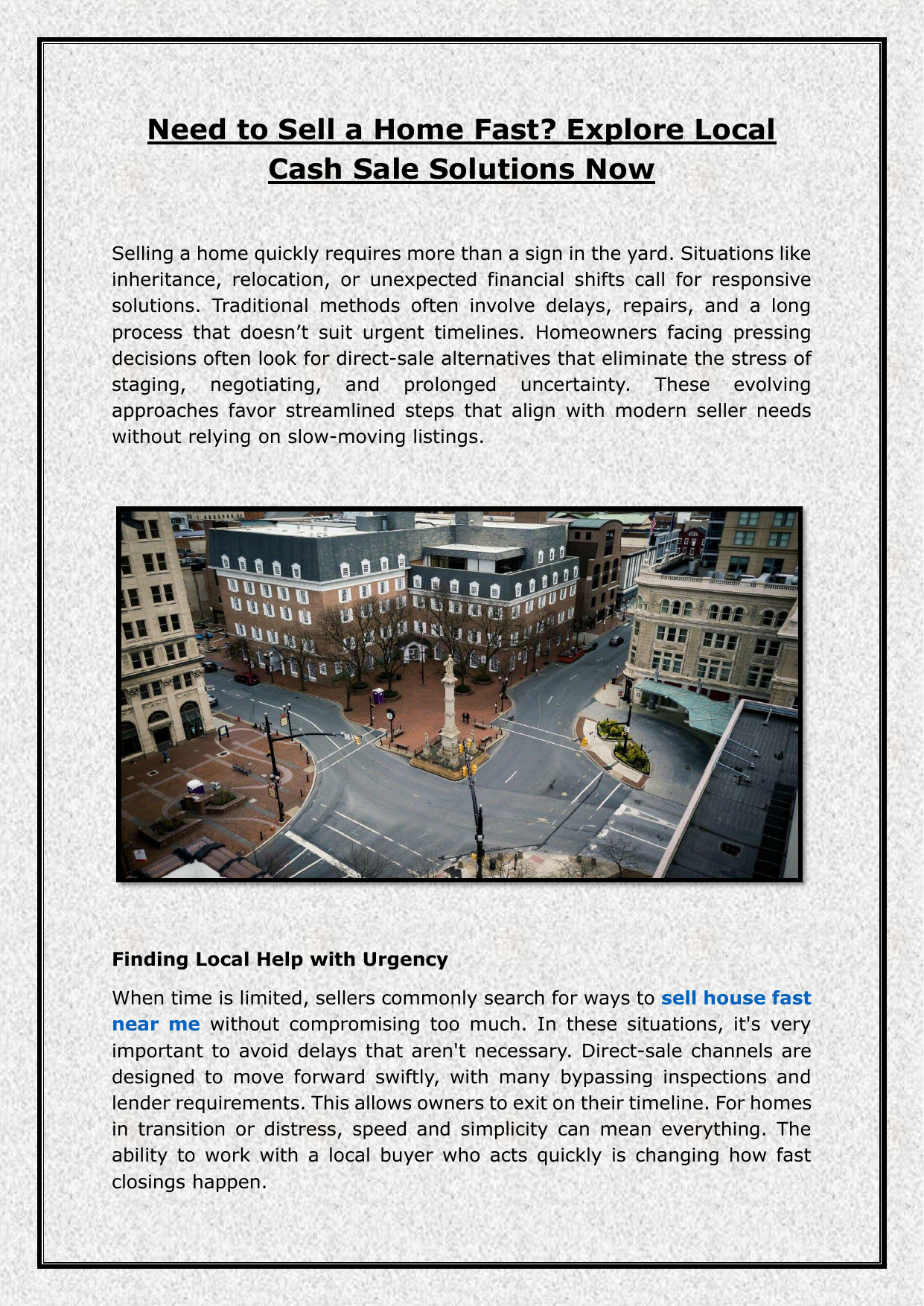 Need to Sell a Home Fast? Explore Local Cash Sale Solutions Now Selling a home quickly requires more than a sign in the yard. Situations like inheritance, relocation, or unexpected financial shifts call for responsive solutions. Traditional methods often involve delays, repairs, and a long process that doesn’t suit urgent timelines. Homeowners facing pressing decisions often look for direct-sale alternatives that eliminate the stress of staging, negotiating, and prolonged uncertainty. These evolving approaches favor streamlined steps that align with modern seller needs without relying on slow-moving listings. Finding Local Help with Urgency When time is limited, sellers commonly search for ways to sell house fast near me without compromising too much. In these situations, it's very important to avoid delays that aren't necessary. Direct-sale channels are designed to move forward swiftly, with many bypassing inspections and lender requirements. This allows owners to exit on their timeline. For homes in transition or distress, speed and simplicity can mean everything. The ability to work with a local buyer who acts quickly is changing how fast closings happen. Removing Obstacles to Close Faster Traditional buyers often want homes in prime condition, but not every property fits that standard. For owners without the time or budget to renovate, listing can become a burden. Direct buyers look past cosmetic flaws and focus on the value of the transaction itself. This makes it possible to skip lengthy showings and jump straight to a sale. The transaction moves with fewer steps, helping owners sidestep market volatility and meet personal timelines without dragging out the process unnecessarily. Selling for Cash with Confidence For those aiming to sell your property fast for cash, reliable buyers offer a path with fewer uncertainties. Cash-based sales don’t hinge on appraisals or mortgage approvals, making them especially practical when closing speed is critical. This method allows sellers to retain control over their schedule, from offer acceptance to settlement. Whether it’s a home with repairs or one that’s been vacant, these transactions simplify what is usually a complex process. The result is clarity, efficiency, and faster financial resolution. Right Choice for Challenging Situations Divorce, relocation, or probate cases create urgency that traditional markets struggle to accommodate. In these cases, choosing to sell your property fast for cash may align more closely with the timeline and emotional bandwidth available. With fewer contingencies, sellers can make confident choices without the pressure of open houses or extensive preparation. These benefits often make a noticeable difference when timelines are tight and flexibility matters most. It’s an approach centered on understanding the seller’s circumstances, not just the property itself. Conclusion Property owners facing urgent timelines no longer need to rely on slow traditional listings. With alternative selling models focused on quick, cashdriven outcomes, it’s now possible to close without unnecessary friction. Visiting jrheller.com opens the door to options built for speed, allowing sellers to move on their terms. This model supports those ready to simplify the process, reduce delays, and step away from unwanted properties. When speed and certainty matter, the path forward doesn’t have to feel uncertain or overwhelming.