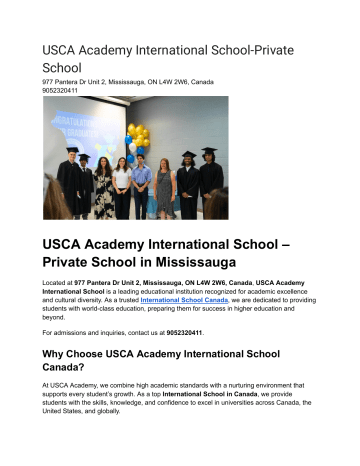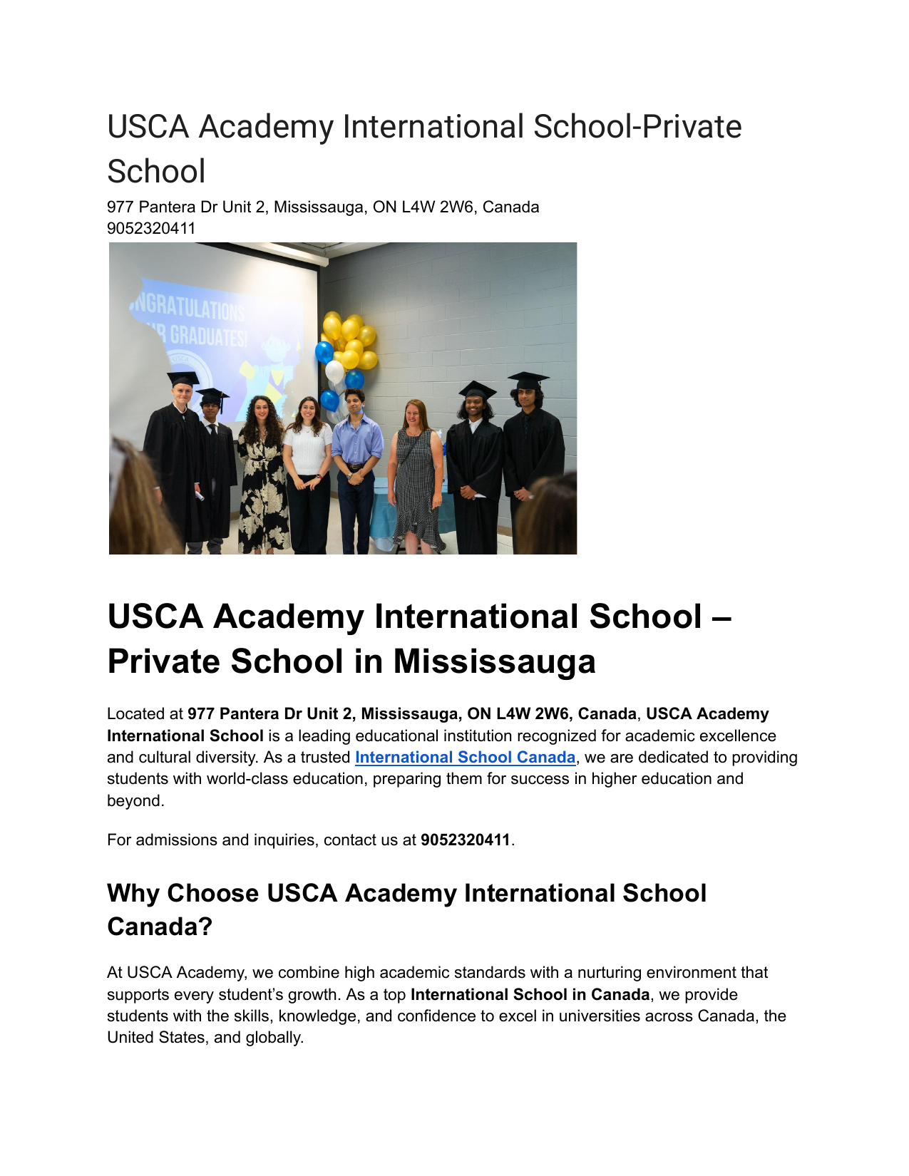 USCA Academy International School-Private School 977 Pantera Dr Unit 2, Mississauga, ON L4W 2W6, Canada 9052320411 USCA Academy International School – Private School in Mississauga Located at 977 Pantera Dr Unit 2, Mississauga, ON L4W 2W6, Canada, USCA Academy International School is a leading educational institution recognized for academic excellence and cultural diversity. As a trusted International School Canada, we are dedicated to providing students with world-class education, preparing them for success in higher education and beyond. For admissions and inquiries, contact us at 9052320411. Why Choose USCA Academy International School Canada? At USCA Academy, we combine high academic standards with a nurturing environment that supports every student’s growth. As a top International School in Canada, we provide students with the skills, knowledge, and confidence to excel in universities across Canada, the United States, and globally. We are committed to: ● Comprehensive Curriculum – Meeting Ontario Ministry of Education standards while integrating global perspectives. ● University Preparation – Our graduates are well-prepared for top universities in Canada and abroad. ● Diverse Community – Students from around the world come together to learn, collaborate, and share cultural experiences. ● Individual Support – With small class sizes, our teachers provide personalized guidance and attention. Academic Programs Offered USCA Academy International School Canada offers a variety of programs tailored to meet the needs of both local and international students: ● Elementary & Secondary Programs ● Ontario Secondary School Diploma (OSSD) ● University Preparation Courses ● ESL Programs for International Students ● Summer & Winter School Programs Our academic pathways ensure students meet provincial standards while gaining the skills necessary to succeed in higher education worldwide. A Global Learning Experience As a distinguished International School in Canada, USCA Academy fosters a multicultural environment where students from diverse backgrounds thrive together. This global exposure not only enhances learning but also helps students develop respect, adaptability, and international awareness—skills essential for future leaders. Contact USCA Academy If you are searching for an International School Canada that combines academic excellence, cultural diversity, and global opportunities, USCA Academy International School is the right choice for your family. ● Address: 977 Pantera Dr Unit 2, Mississauga, ON L4W 2W6, Canada ● Phone: 9052320411 Take the next step in your child’s education journey with USCA Academy International School – a trusted International School Canada.