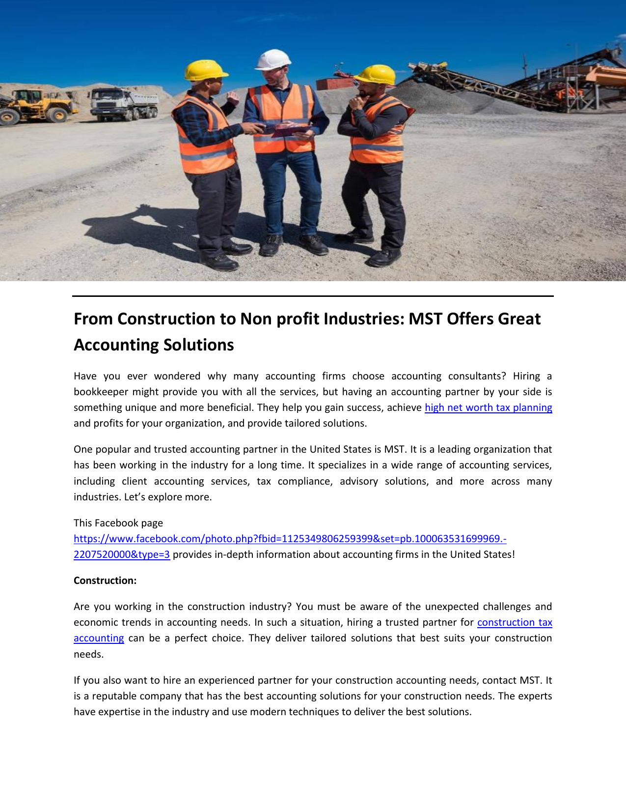 From Construction to Non profit Industries: MST Offers Great Accounting Solutions Have you ever wondered why many accounting firms choose accounting consultants? Hiring a bookkeeper might provide you with all the services, but having an accounting partner by your side is something unique and more beneficial. They help you gain success, achieve high net worth tax planning and profits for your organization, and provide tailored solutions. One popular and trusted accounting partner in the United States is MST. It is a leading organization that has been working in the industry for a long time. It specializes in a wide range of accounting services, including client accounting services, tax compliance, advisory solutions, and more across many industries. Let’s explore more. This Facebook page https://www.facebook.com/photo.php?fbid=1125349806259399&set=pb.100063531699969.2207520000&type=3 provides in-depth information about accounting firms in the United States! Construction: Are you working in the construction industry? You must be aware of the unexpected challenges and economic trends in accounting needs. In such a situation, hiring a trusted partner for construction tax accounting can be a perfect choice. They deliver tailored solutions that best suits your construction needs. If you also want to hire an experienced partner for your construction accounting needs, contact MST. It is a reputable company that has the best accounting solutions for your construction needs. The experts have expertise in the industry and use modern techniques to deliver the best solutions. Hospitality: In hospitality, keeping things and data organized and up-to-date is fundamental. To manage all such services, hiring a professional accounting partner is a good choice. One such popular firm is MST. It has an expert team of accountants that helps your business stay updated on modern accounting needs. They help in making strategic decisions, managing payroll, and more. Wholesale and Retail: Accounting services are also essential in retail and wholesale businesses. MST offers the best accounting services to such industries. Its services help them streamline their business operation and achieve higher growth. The expert accountants offer great advisory support. They help you with your inventory management. In a nutshell, MST offers the best and most affordable operational and financial strategies across several industries to help them achieve higher goals and success. Count on this platform for your upcoming non profit bookkeeping and accounting services needs in the United States. For more information, refer to this link https://www.mstiller.com/ Contact: 4785594467 Original Source: https://bit.ly/3IaePPD