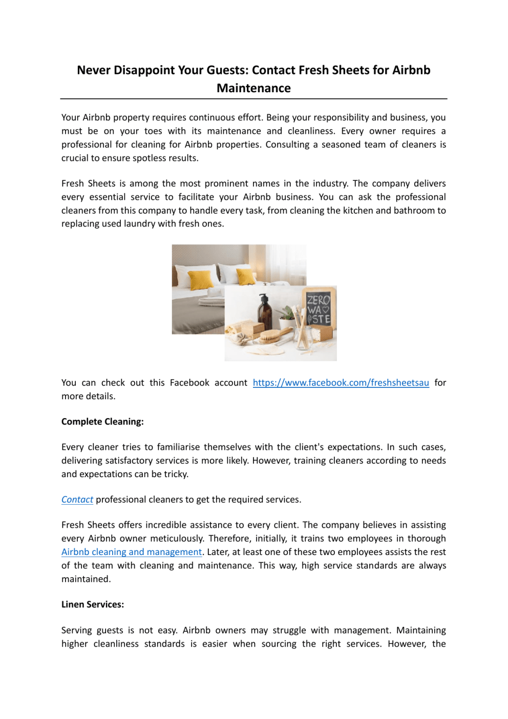 Never Disappoint Your Guests: Contact Fresh Sheets for Airbnb Maintenance Your Airbnb property requires continuous effort. Being your responsibility and business, you must be on your toes with its maintenance and cleanliness. Every owner requires a professional for cleaning for Airbnb properties. Consulting a seasoned team of cleaners is crucial to ensure spotless results. Fresh Sheets is among the most prominent names in the industry. The company delivers every essential service to facilitate your Airbnb business. You can ask the professional cleaners from this company to handle every task, from cleaning the kitchen and bathroom to replacing used laundry with fresh ones. You can check out this Facebook account https://www.facebook.com/freshsheetsau for more details. Complete Cleaning: Every cleaner tries to familiarise themselves with the client's expectations. In such cases, delivering satisfactory services is more likely. However, training cleaners according to needs and expectations can be tricky. Contact professional cleaners to get the required services. Fresh Sheets offers incredible assistance to every client. The company believes in assisting every Airbnb owner meticulously. Therefore, initially, it trains two employees in thorough Airbnb cleaning and management. Later, at least one of these two employees assists the rest of the team with cleaning and maintenance. This way, high service standards are always maintained. Linen Services: Serving guests is not easy. Airbnb owners may struggle with management. Maintaining higher cleanliness standards is easier when sourcing the right services. However, the problem can surface with elements used by guests. For instance, linen is a part of a severe issue in the process. Check out this page for reliable services https://freshsheets.com.au/. Fresh Sheets can address this concern, too. The company knows how to serve its clients with the necessary solutions. Blankets, bedsheets, pillow covers, and duvet covers are crucial. Therefore, this company sources exceptional linen for Airbnb owners and their businesses. It supports their needs and ensures satisfactory customer service. Connect with this linen service now! Handling Cleaning Using the Efficient Supplies: Airbnb owners consider professional help to handle regular cleaning and maintenance tasks. But this is not it! They also ask professionals to transform the space. Airbnb cleaning companies offer tremendous Airbnb changeover service. Fresh Sheets can help you with changeover services. Along with this, the company ensures excellent results. They use suitable cleaning products to make the space spotless. Airbnb owners do not need to source any cleaning supplies. So, consult this professional service and simplify Airbnb cleaning and maintenance procedures. You can learn more about this service at https://freshsheets.com.au/ Original Source: https://bit.ly/4n3t8EI