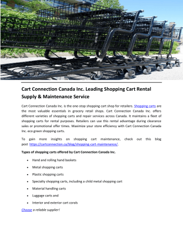 Cart Connection Canada Inc. Leading Shopping Cart Rental Supply & Maintenance Service Cart Connection Canada Inc. is the one-stop shopping cart shop for retailers. Shopping carts are the most valuable essentials in grocery retail shops. Cart Connection Canada Inc. offers different varieties of shopping carts and repair services across Canada. It maintains a fleet of shopping carts for rental purposes. Retailers can use this rental advantage during clearance sales or promotional offer times. Maximize your store efficiency with Cart Connection Canada Inc. eco green shopping carts. To gain more insights on shopping cart maintenance, post https://cartconnection.ca/blog/shopping-cart-maintenance/. Types of shopping carts offered by Cart Connection Canada Inc. Hand and rolling hand baskets Metal shopping carts Plastic shopping carts Specialty shopping carts, including a child metal shopping cart Material handling carts Luggage carts and Interior and exterior cart corals Choose a reliable supplier! check out this blog Choose the right shopping cart for your store Although there are many varieties of carts to choose from, selecting the right cart for your store's needs is crucial in providing customer satisfaction. A well-chosen size, material, and type helps streamline the store operations. Cart Connection Canada Inc. offers three different sizes of carts: small, medium, and large. Choose plastic shopping carts if your store needs lightweight, easily carried carts. If you run a grocery store, a sturdier metal cart is required. Check out more cart options! Cart Connection Canada Inc. shopping carts offer extra features Cart Connection Canada Inc. Shopping carts have extra features, including cup holders, a handgrip, and signage. To provide security from theft, it incorporates a shopping cart wheel lock system, anti-theft poles, and coin locks to access and remain secure in store premises. Maintenance and repair services Proper shopping cart maintenance services are key to developing a good impression on your store. Imagine your customer reaching for a wobbly, messy cart with a freaky wheel. Think what impression it will leave on them. Cart Connection Canada Inc.'s regular shopping cart maintenance includes inspection and on-site resolving for minor repairs such as wheel fixings. Other maintenance services and shopping cart replacement wheel repairs include power washing, corral installation, and part replacements. Inappropriate shopping carts show a negative impact on the store, decreasing sales. If you're a business with no idea about shopping carts, Cart Connection Canada Inc. gives full assistance in selecting the best-fitted shopping carts for your aisle. Need more information on shopping carts? Visit https://cartconnection.ca/ Contact: +1 800-533-0947 Email: [email protected] Original Source: http://bit.ly/3VIBaqF