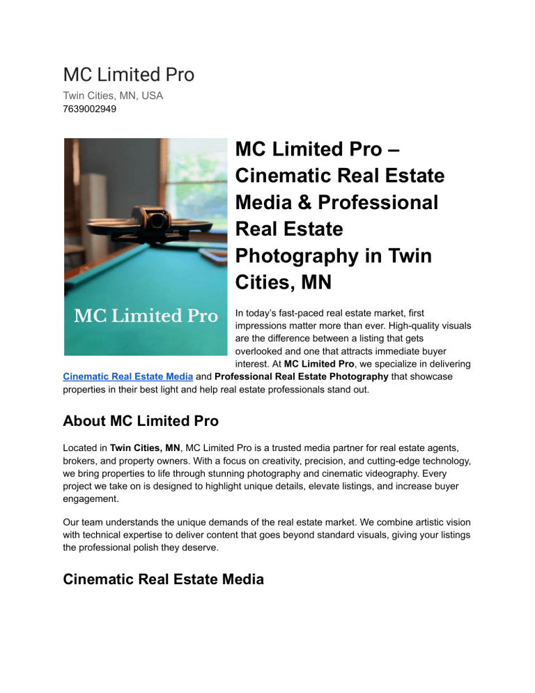 MC Limited Pro Twin Cities, MN, USA 7639002949 MC Limited Pro – Cinematic Real Estate Media & Professional Real Estate Photography in Twin Cities, MN In today’s fast-paced real estate market, first impressions matter more than ever. High-quality visuals are the difference between a listing that gets overlooked and one that attracts immediate buyer interest. At MC Limited Pro, we specialize in delivering Cinematic Real Estate Media and Professional Real Estate Photography that showcase properties in their best light and help real estate professionals stand out. About MC Limited Pro Located in Twin Cities, MN, MC Limited Pro is a trusted media partner for real estate agents, brokers, and property owners. With a focus on creativity, precision, and cutting-edge technology, we bring properties to life through stunning photography and cinematic videography. Every project we take on is designed to highlight unique details, elevate listings, and increase buyer engagement. Our team understands the unique demands of the real estate market. We combine artistic vision with technical expertise to deliver content that goes beyond standard visuals, giving your listings the professional polish they deserve. Cinematic Real Estate Media When it comes to selling properties, video is no longer a luxury—it’s a necessity. Our Cinematic Real Estate Media services create immersive experiences that capture attention and spark emotion. ● Cinematic property tours designed to showcase the flow and feel of a home. ● Drone videography for breathtaking aerial views that highlight the property and surrounding area. ● Engaging storytelling that helps buyers imagine themselves in the space. These cinematic productions are perfect for online listings, social media campaigns, and agent branding, providing an edge in a highly competitive market. Professional Real Estate Photography Photos remain one of the most powerful tools in real estate marketing. Our Professional Real Estate Photography services are crafted to make every listing shine: ● High-resolution images that capture every detail with clarity and vibrancy. ● Expert composition and lighting to present rooms in their best perspective. ● Quick turnaround so agents can list properties without delays. From cozy starter homes to luxury estates, we ensure every property looks appealing, warm, and market-ready. Why Choose MC Limited Pro? ● Twin Cities Expertise – We know the local market and buyer expectations. ● Cinematic Quality – Our work goes beyond standard photography, creating lasting impressions. ● Client-Centered Approach – Every project is customized to fit your goals. ● Proven Results – Professional visuals help listings sell faster and often at higher prices. Contact MC Limited Pro Take your property listings to the next level with Cinematic Real Estate Media and Professional Real Estate Photography by MC Limited Pro. ● Business Name: MC Limited Pro ● Address: Twin Cities, MN, USA ● Phone: 763-900-2949 Let us help you capture the essence of every property and give your listings the attention they deserve.