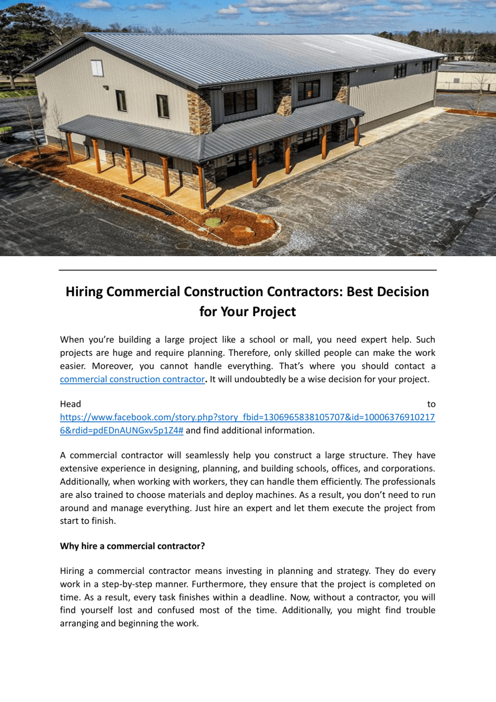 Hiring Commercial Construction Contractors: Best Decision for Your Project When you’re building a large project like a school or mall, you need expert help. Such projects are huge and require planning. Therefore, only skilled people can make the work easier. Moreover, you cannot handle everything. That’s where you should contact a commercial construction contractor. It will undoubtedly be a wise decision for your project. Head to https://www.facebook.com/story.php?story_fbid=1306965838105707&id=10006376910217 6&rdid=pdEDnAUNGxv5p1Z4# and find additional information. A commercial contractor will seamlessly help you construct a large structure. They have extensive experience in designing, planning, and building schools, offices, and corporations. Additionally, when working with workers, they can handle them efficiently. The professionals are also trained to choose materials and deploy machines. As a result, you don’t need to run around and manage everything. Just hire an expert and let them execute the project from start to finish. Why hire a commercial contractor? Hiring a commercial contractor means investing in planning and strategy. They do every work in a step-by-step manner. Furthermore, they ensure that the project is completed on time. As a result, every task finishes within a deadline. Now, without a contractor, you will find yourself lost and confused most of the time. Additionally, you might find trouble arranging and beginning the work. Secondly, when you hire a normal contractor, they cannot help but save money. Therefore, it is better to call commercial contractors. They understand the local market and prices of raw materials. As a result, you get material at steep prices and save on unnecessary expenses. Therefore, hiring a commercial contractor is worth every penny. Lastly, these skilled workers are well aware of the local rules and government guidelines. As a result, they always abide by these regulations. So, you don’t have to worry about getting a sudden legal notice. Let the contractors handle every work with professionalism and guidelines. Long-lasting benefits One benefit of hiring a commercial contractor is that you get a building that looks stunning for years to come. Additionally, if you want to sell it in the future, it’ll easily attract customers and prospects. Furthermore, the final project is always free from cracks, chips, and holes. Therefore, investing in a good commercial builder is key. So, if you want elite commercial contracting services, choose Magnum Contracting. It is also a renowned design build construction company in Atlanta. Thus, hire them to build a jawdropping and strong commercial building in this location. To get more details, visit https://magnumcontracting.net/ Contact: (770) 421-6300 Original Source: https://bit.ly/46neOA0