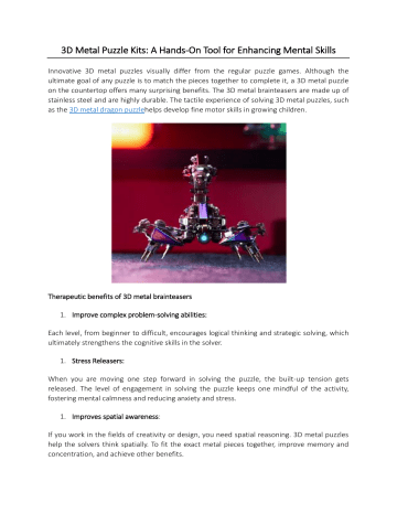 3D Metal Puzzle Kits: A Hands-On Tool for Enhancing Mental Skills Innovative 3D metal puzzles visually differ from the regular puzzle games. Although the ultimate goal of any puzzle is to match the pieces together to complete it, a 3D metal puzzle on the countertop offers many surprising benefits. The 3D metal brainteasers are made up of stainless steel and are highly durable. The tactile experience of solving 3D metal puzzles, such as the 3D metal dragon puzzlehelps develop fine motor skills in growing children. Therapeutic benefits of 3D metal brainteasers 1. Improve complex problem-solving abilities: Each level, from beginner to difficult, encourages logical thinking and strategic solving, which ultimately strengthens the cognitive skills in the solver. 1. Stress Releasers: When you are moving one step forward in solving the puzzle, the built-up tension gets released. The level of engagement in solving the puzzle keeps one mindful of the activity, fostering mental calmness and reducing anxiety and stress. 1. Improves spatial awareness: If you work in the fields of creativity or design, you need spatial reasoning. 3D metal puzzles help the solvers think spatially. To fit the exact metal pieces together, improve memory and concentration, and achieve other benefits. Tips while assembling 3D metal puzzles Solving a 3D metal puzzle, such as a 3D metal puzzle scorpion set, requires lots of patience and hours dedicated to solving the puzzle with precision. If you are new to 3D metal puzzles, start with the easy level that gives you simpler models before advancing to the challenging levels. Before assembling the metal pieces, lay them out and organise them so that it will be easier to identify the pieces. Then, use the instruction manual for assembling. This way, you can solve the puzzle faster. The metal pieces assembling and detaching require tweezers, which can help you with the intricate metal piece connections. These small pliers and tweezers will be provided with the puzzle kits, so use them. Before starting the puzzle solving, read the instruction guide, don’t miss out the illustrated diagrams, and study carefully to avoid any false attachments. Ditch puzzle apps and get a hands-on 3D metal puzzle kit today! About Mostarle: Mostarle is an innovative company dedicated to transforming ever-evolving products into innovative 3D metal puzzles. At most stores, one can find sci-fi-inspired terrestrial and human-made challenging 3D metal puzzles such as the Terminator 3D model. The company collaborates with creative minds to bring out new horizons of innovation in puzzle brainteasers. For more information, visit https://www.mostarle.com/. Original source: http://bit.ly/4n3T03x