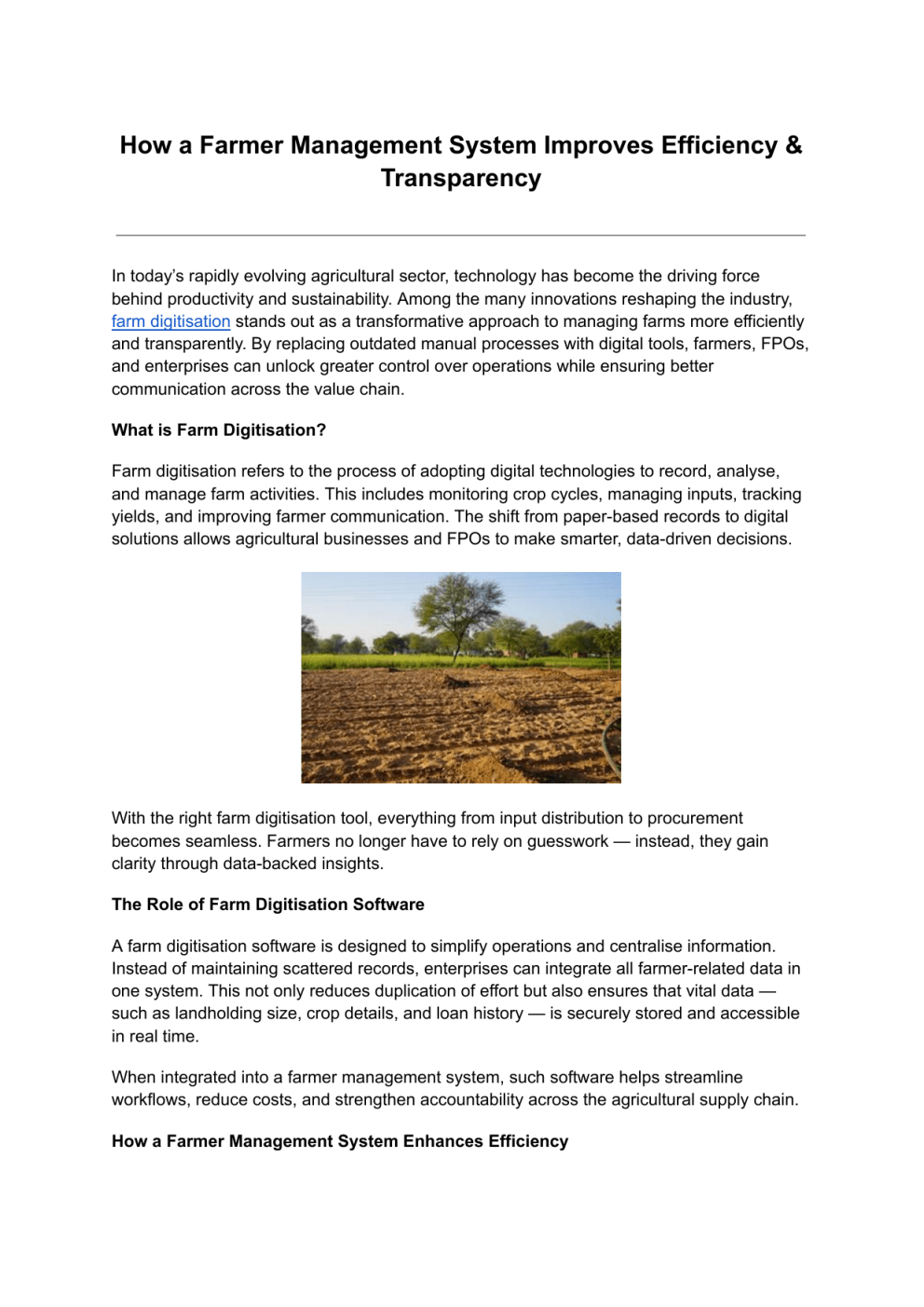 How a Farmer Management System Improves Efficiency & Transparency In today’s rapidly evolving agricultural sector, technology has become the driving force behind productivity and sustainability. Among the many innovations reshaping the industry, farm digitisation stands out as a transformative approach to managing farms more efficiently and transparently. By replacing outdated manual processes with digital tools, farmers, FPOs, and enterprises can unlock greater control over operations while ensuring better communication across the value chain. What is Farm Digitisation? Farm digitisation refers to the process of adopting digital technologies to record, analyse, and manage farm activities. This includes monitoring crop cycles, managing inputs, tracking yields, and improving farmer communication. The shift from paper-based records to digital solutions allows agricultural businesses and FPOs to make smarter, data-driven decisions. With the right farm digitisation tool, everything from input distribution to procurement becomes seamless. Farmers no longer have to rely on guesswork — instead, they gain clarity through data-backed insights. The Role of Farm Digitisation Software A farm digitisation software is designed to simplify operations and centralise information. Instead of maintaining scattered records, enterprises can integrate all farmer-related data in one system. This not only reduces duplication of effort but also ensures that vital data — such as landholding size, crop details, and loan history — is securely stored and accessible in real time. When integrated into a farmer management system, such software helps streamline workflows, reduce costs, and strengthen accountability across the agricultural supply chain. How a Farmer Management System Enhances Efficiency A well-structured farmer management system enables agri businesses and FPOs to digitise their operations at scale. Here’s how it boosts efficiency: 1. Data Centralisation – Instead of managing multiple spreadsheets, organisations can access all farmer profiles in one place. 2. Resource Allocation – Inputs like seeds, fertilisers, and machinery can be distributed based on real demand. 3. Time-Saving – Automated record-keeping reduces administrative overhead. 4. Better Planning – Predictive insights allow enterprises to align procurement with market demand. By improving efficiency, enterprises also reduce wastage and cut operational costs — which directly benefits both businesses and farmers. How It Improves Transparency Transparency is critical in agriculture, especially for FPOs and supply chain partners. With FPO digitisation, members gain clear visibility into all transactions, from input procurement to profit distribution. Every activity is recorded digitally, ensuring accountability at each step. Similarly, an agri digitisation platform empowers farmers by giving them access to accurate information and real-time updates. Whether it’s crop pricing, market demand, or government schemes, digital platforms build trust by ensuring that no critical detail is hidden or delayed. Enterprise Solutions for Farm Digitisation Large-scale agribusinesses often face the challenge of managing thousands of farmer relationships at once. An enterprise solution for farm digitisation offers scalability — allowing companies to digitise operations across multiple regions or crop clusters. By adopting such solutions, enterprises gain deeper insights into productivity trends, compliance requirements, and sustainability goals. The Future of Agriculture with Digitisation The agricultural sector is at the cusp of a digital revolution. From basic record-keeping to advanced AI-driven analytics, farm digitisation is no longer optional — it’s essential for growth. Farmers equipped with digital tools are more empowered to negotiate prices, access credit, and adopt modern practices, while enterprises benefit from enhanced traceability and stronger farmer relationships. Conclusion A farmer management system is more than just a software tool — it is the backbone of modern agriculture. By improving efficiency and ensuring transparency, it bridges the gap between farmers, FPOs, and enterprises. With innovations in farm digitisation, farm digitisation software, and enterprise solutions for farm digitisation, the future of agriculture looks smarter, more sustainable, and inclusive.