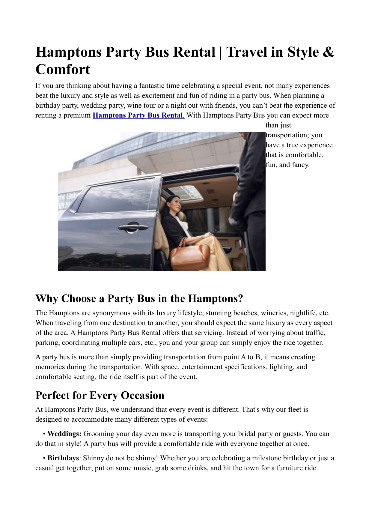 Hamptons Party Bus Rental | Travel in Style & Comfort If you are thinking about having a fantastic time celebrating a special event, not many experiences beat the luxury and style as well as excitement and fun of riding in a party bus. When planning a birthday party, wedding party, wine tour or a night out with friends, you can’t beat the experience of renting a premium Hamptons Party Bus Rental. With Hamptons Party Bus you can expect more than just transportation; you have a true experience that is comfortable, fun, and fancy. Why Choose a Party Bus in the Hamptons? The Hamptons are synonymous with its luxury lifestyle, stunning beaches, wineries, nightlife, etc. When traveling from one destination to another, you should expect the same luxury as every aspect of the area. A Hamptons Party Bus Rental offers that servicing. Instead of worrying about traffic, parking, coordinating multiple cars, etc., you and your group can simply enjoy the ride together. A party bus is more than simply providing transportation from point A to B, it means creating memories during the transportation. With space, entertainment specifications, lighting, and comfortable seating, the ride itself is part of the event. Perfect for Every Occasion At Hamptons Party Bus, we understand that every event is different. That's why our fleet is designed to accommodate many different types of events: • Weddings: Grooming your day even more is transporting your bridal party or guests. You can do that in style! A party bus will provide a comfortable ride with everyone together at once. • Birthdays: Shinny do not be shinny! Whether you are celebrating a milestone birthday or just a casual get together, put on some music, grab some drinks, and hit the town for a furniture ride. • Wine Tours: The Hamptons is famous for its wineries. A party bus takes care of transportation so you can focus on tasting. Our professional chauffeurs do all the driving. • Corporate Events: Make a lasting impression with clients. Providing a sophisticated travel option for clients or rewarding employees with a party bus rental can take your organization to a new level. • Nights Out: Whether you have a bachelor or bachelorette party or just a fun night with friends a Hamptons Party Bus Rental means the party starts as soon as you step on board. The Luxury Experience You Deserve When you choose Hamptons Party Bus, you are not just hiring a ride, you are hiring a great travel experience. All Hamptons party buses come with a variety of features to make sure that you will enjoy your trip, such features include: • Comfortable Seating: The interior is designed for all sized groups while allowing everyone to stretch out comfortably. • Quality Sound Systems: You will be able to play your favorite songs, so the good times will keep rolling. • LED/Ambient Lighting: The buses have adjustable colored interior lights, so you have your own party going when traveling or on the way home! • Entertainment Features: Whether it be a TV for movies or Bluetooth for your own music, we have you covered. • Professional Chaffuer: This is what you have paid for, and we take all of our clients very seriously, so you can be confident that you will receive a professional, knowledgeable, capable and timely ride. Every detail is designed to ensure that your whole group feels like VIP's from start to finish. Why Hamptons Party Bus Stands Out There are plenty of ways to get around the Hamptons, but Hamptons Party Bus delivers the best customer satisfaction and service you can find. Here are the reasons why people choose us: 1. Luxury Fleet: We take great care of our vehicles to keep them clean, sleek and dependable. 2. Available 24-7: If your event is during the day or at a late hour, we can provide services for your needs. 3. Customizable Packages: Each festivity is unique. We offer flexibility in rent time to help create your memorable experience. 4. Affordable Luxury: When it comes to premium service, you don't have to pay the price. We offer lower rates and guarantee quality at every turn. A Hamptons Party Bus Rental is not just renting a vehicle; it’s the ultimate experience customized to make your memories more enjoyable. Stress-Free Group Travel Arranging group travel can be tricky - especially in a location that draws crowds like the Hamptons. From parking, to staying on schedule, to keeping everyone together – driving can become a rest continuous hassle, even a stressful experience. A party bus takes the headache out of your party plans. You and your guests can focus on fun, not logistics, while our professional drivers handle the rest. Everyone arrives together and on time, and everyone will be happy campers! Making Memories That Last The best parts of an event are often found along the way. Singing along to the tune of your favorite musing, cracking jokes with friends and feeling the energy of the ride as you drive. These experiences become memories. Transportation is important because with Hamptons Party Bus, your trip is just as much fun as the destination itself! Booking Your Hamptons Party Bus Rental Making a booking with us is simple and easy! Just let us know your event details—date, how big your group is, and where you are headed, and we will recommend the best party bus to fit your needs. We are committed to making the booking process so simple and carefree that you can sit back and just have fun with your event. It doesn't matter if you are booking eight months in advance or if you need something last minute. We will work with you to make it happen. Final Thoughts If you are in search of the top Hamptons Party Bus Rental then you have come to the right place: Hamptons Party Bus. We excel at taking basic transportation and transforming it into extraordinary experience. We are able to provide transportation for any celebration including weddings, birthdays, wine tours, corporate events, and more! Our luxurious fleet and professional servic