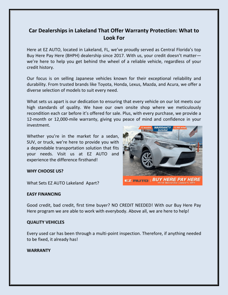 Car Dealerships in Lakeland That Offer Warranty Protection: What to Look For Here at EZ AUTO, located in Lakeland, FL, we’ve proudly served as Central Florida’s top Buy Here Pay Here (BHPH) dealership since 2017. With us, your credit doesn’t matter— we’re here to help you get behind the wheel of a reliable vehicle, regardless of your credit history. Our focus is on selling Japanese vehicles known for their exceptional reliability and durability. From trusted brands like Toyota, Honda, Lexus, Mazda, and Acura, we offer a diverse selection of models to suit every need. What sets us apart is our dedication to ensuring that every vehicle on our lot meets our high standards of quality. We have our own onsite shop where we meticulously recondition each car before it’s offered for sale. Plus, with every purchase, we provide a 12-month or 12,000-mile warranty, giving you peace of mind and confidence in your investment. Whether you’re in the market for a sedan, SUV, or truck, we’re here to provide you with a dependable transportation solution that fits your needs. Visit us at EZ AUTO and experience the difference firsthand! WHY CHOOSE US? What Sets EZ AUTO Lakeland Apart? EASY FINANCING Good credit, bad credit, first time buyer? NO CREDIT NEEDED! With our Buy Here Pay Here program we are able to work with everybody. Above all, we are here to help! QUALITY VEHICLES Every used car has been through a multi-point inspection. Therefore, if anything needed to be fixed, it already has! WARRANTY Our Buy Here Pay Here used car inventory comes with a Limited Warranty of at least 12 months / 12,000 miles. For more information about Auburndale Buy Here Pay here visit here Store Location | Hours of Operation 1612 W Memorial Blvd Lakeland, FL 33815 Monday: 9:00 AM - 6:00 PM Tuesday: 9:00 AM - 6:00 PM Wednesday: 9:00 AM - 6:00 PM Thursday: 9:00 AM - 6:00 PM Friday: 9:00 AM - 6:00 PM Saturday: 10:00 AM - 4:00 PM Sunday: CLOSED