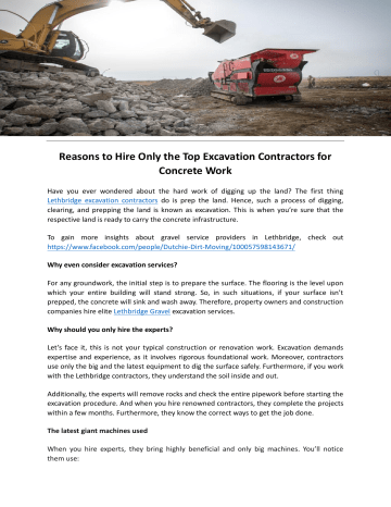 Reasons to Hire Only the Top Excavation Contractors for Concrete Work Have you ever wondered about the hard work of digging up the land? The first thing Lethbridge excavation contractors do is prep the land. Hence, such a process of digging, clearing, and prepping the land is known as excavation. This is when you’re sure that the respective land is ready to carry the concrete infrastructure. To gain more insights about gravel service providers in Lethbridge, check out https://www.facebook.com/people/Dutchie-Dirt-Moving/100057598143671/ Why even consider excavation services? For any groundwork, the initial step is to prepare the surface. The flooring is the level upon which your entire building will stand strong. So, in such situations, if your surface isn’t prepped, the concrete will sink and wash away. Therefore, property owners and construction companies hire elite Lethbridge Gravel excavation services. Why should you only hire the experts? Let’s face it, this is not your typical construction or renovation work. Excavation demands expertise and experience, as it involves rigorous foundational work. Moreover, contractors use only the big and the latest equipment to dig the surface safely. Furthermore, if you work with the Lethbridge contractors, they understand the soil inside and out. Additionally, the experts will remove rocks and check the entire pipework before starting the excavation procedure. And when you hire renowned contractors, they complete the projects within a few months. Furthermore, they know the correct ways to get the job done. The latest giant machines used When you hire experts, they bring highly beneficial and only big machines. You’ll notice them use: Excavators to dig in the ground or soil Bulldozers to push out any rocks from the surface Graders to bring the ground to the same level The right technology helps contractors dig to the correct depth. Excavation is no joke You cannot consider excavation to be seamless and safe. It consists of potential dangers that can even risk human lives. This is why you should only hire expert contractors who follow safety guidelines. Hence, they ensure the property is clear and workers are safe during excavation. As a result, excavation contractors ensure that Lethbridge only has strong bridges and roads. They go deep and remove every old and unwanted object from the construction site. About Dutchie Dirt Moving Ltd.: If you’re seeking expert excavation contractors, contact Dutchie Dirt Moving Ltd. Moreover, you can find crushed gravel near me at this company. You can rely on the technicians here for Lethbridge excavation services. Go ahead and browse the website for an array of gravel products. To get more details, visit https://dutchiedirtmoving.com/ Contact Here: 403 738-4033 Mail: [email protected] Original Source: https://bit.ly/48sItu6
