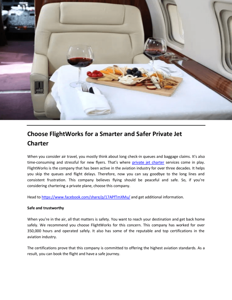 Choose FlightWorks for a Smarter and Safer Private Jet Charter When you consider air travel, you mostly think about long check-in queues and baggage claims. It's also time-consuming and stressful for new flyers. That’s where private jet charter services come in play. FlightWorks is the company that has been active in the aviation industry for over three decades. It helps you skip the queues and flight delays. Therefore, now you can say goodbye to the long lines and consistent frustration. This company believes flying should be peaceful and safe. So, if you’re considering chartering a private plane, choose this company. Head to https://www.facebook.com/share/p/17APfTmXMu/ and get additional information. Safe and trustworthy When you’re in the air, all that matters is safety. You want to reach your destination and get back home safely. We recommend you choose FlightWorks for this concern. This company has worked for over 350,000 hours and operated safely. It also has some of the reputable and top certifications in the aviation industry. The certifications prove that this company is committed to offering the highest aviation standards. As a result, you can book the flight and have a safe journey. Choose a tailored fleet for your journey FlightWorks understands that every trip requires a different plane size. Therefore, you will not get the same private plane charter with this company for every tour. This company has the right private jet to fly two or a group of people. Do you want to fly overseas for a corporate event with your team? If so, you can book the ultra-long-range aircraft from this company. You will reach your destination directly on this continent connecting flight. As a result, there is no halt or waiting time. Plus, you get the perfect flight to take you anywhere around the globe. A service that’s always available People usually opt for private planes as they are flexible. It means you can board the flight at any moment and land at your destination. FlightWorks provides unparalleled services in this arena. With this company, you can book and reschedule your private jet at any moment. Do you have a family emergency to attend to? Book a private plane with this company and travel with speed and safety. So, you shouldn’t settle for anything less than FlightWorks’ private jet Washington DC. This is your opportunity to save your travel time and spend it on important tasks. To get more details, visit https://www.flightworks.com/ Contact: 7708847236 Original Source: https://bit.ly/48v5tZp