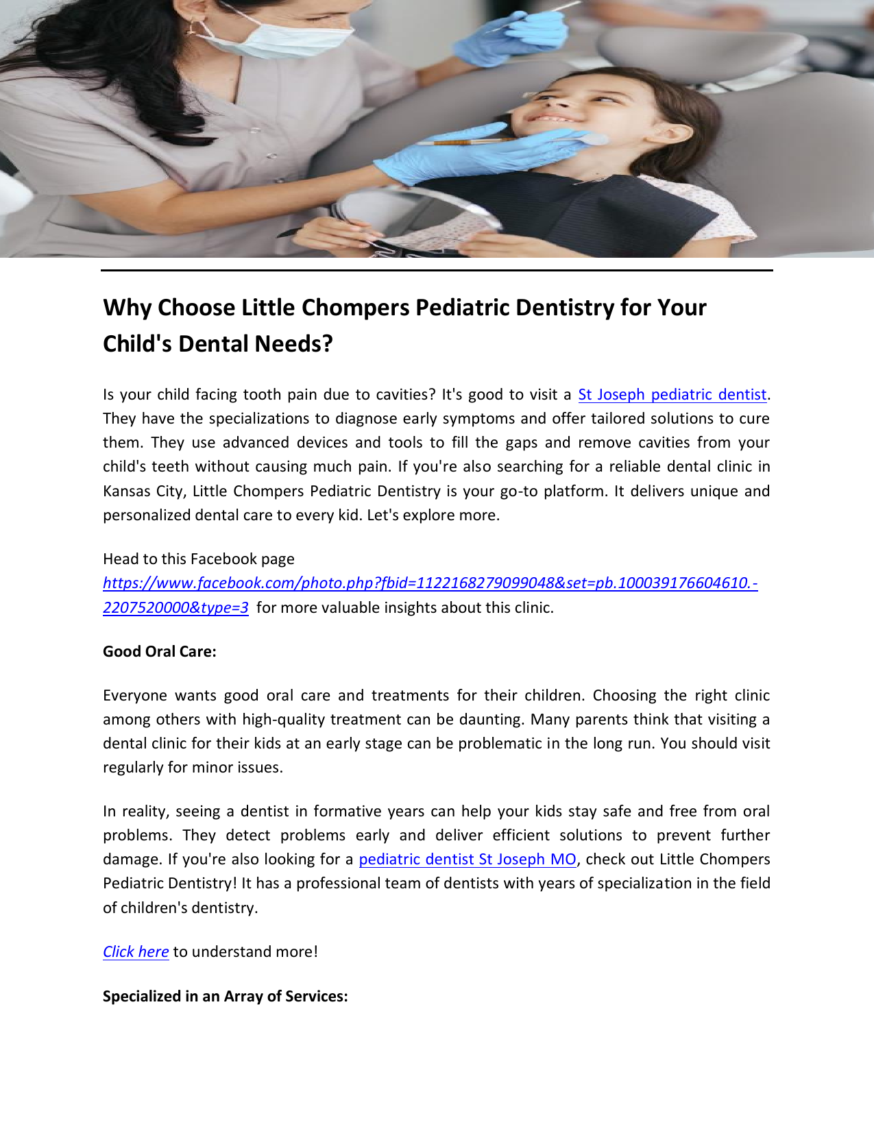 Why Choose Little Chompers Pediatric Dentistry for Your Child's Dental Needs? Is your child facing tooth pain due to cavities? It's good to visit a St Joseph pediatric dentist. They have the specializations to diagnose early symptoms and offer tailored solutions to cure them. They use advanced devices and tools to fill the gaps and remove cavities from your child's teeth without causing much pain. If you're also searching for a reliable dental clinic in Kansas City, Little Chompers Pediatric Dentistry is your go-to platform. It delivers unique and personalized dental care to every kid. Let's explore more. Head to this Facebook page https://www.facebook.com/photo.php?fbid=1122168279099048&set=pb.100039176604610.2207520000&type=3 for more valuable insights about this clinic. Good Oral Care: Everyone wants good oral care and treatments for their children. Choosing the right clinic among others with high-quality treatment can be daunting. Many parents think that visiting a dental clinic for their kids at an early stage can be problematic in the long run. You should visit regularly for minor issues. In reality, seeing a dentist in formative years can help your kids stay safe and free from oral problems. They detect problems early and deliver efficient solutions to prevent further damage. If you're also looking for a pediatric dentist St Joseph MO, check out Little Chompers Pediatric Dentistry! It has a professional team of dentists with years of specialization in the field of children's dentistry. Click here to understand more! Specialized in an Array of Services: Another reason to choose Little Chompers Pediatric Dentistry over other dental clinics in Kansas City is that it offers a comprehensive range of services for children's dental needs. The dentist at this clinic specializes in post-operative care, preventive dentistry, emergency services, special needs care, and Pediatric dentistry. You can opt for the one tailored to your kid's dental needs. For instance, if your child is suffering from bite problems or jaw growth issues, visiting the pediatric dentists Parkville MO can be advantageous. Little Chompers Pediatric Dentistry has a welcoming and playful environment for kids. The dentist offers excellent and compassionate care, providing peace of mind. For more insights, connect with the dentists now! In a nutshell, picking Little Chompers Pediatric Dentistry over other dental clinics offers numerous advantages. It delivers comprehensive dental care with safety as the top priority. You don't need to worry about any injury or harmful effects from getting treatments from such specialized dentists. To get more information, visit https://littlechomperspd.com/ Contact: (816) 957-1023 Original Source: http://bit.ly/46Aagrf