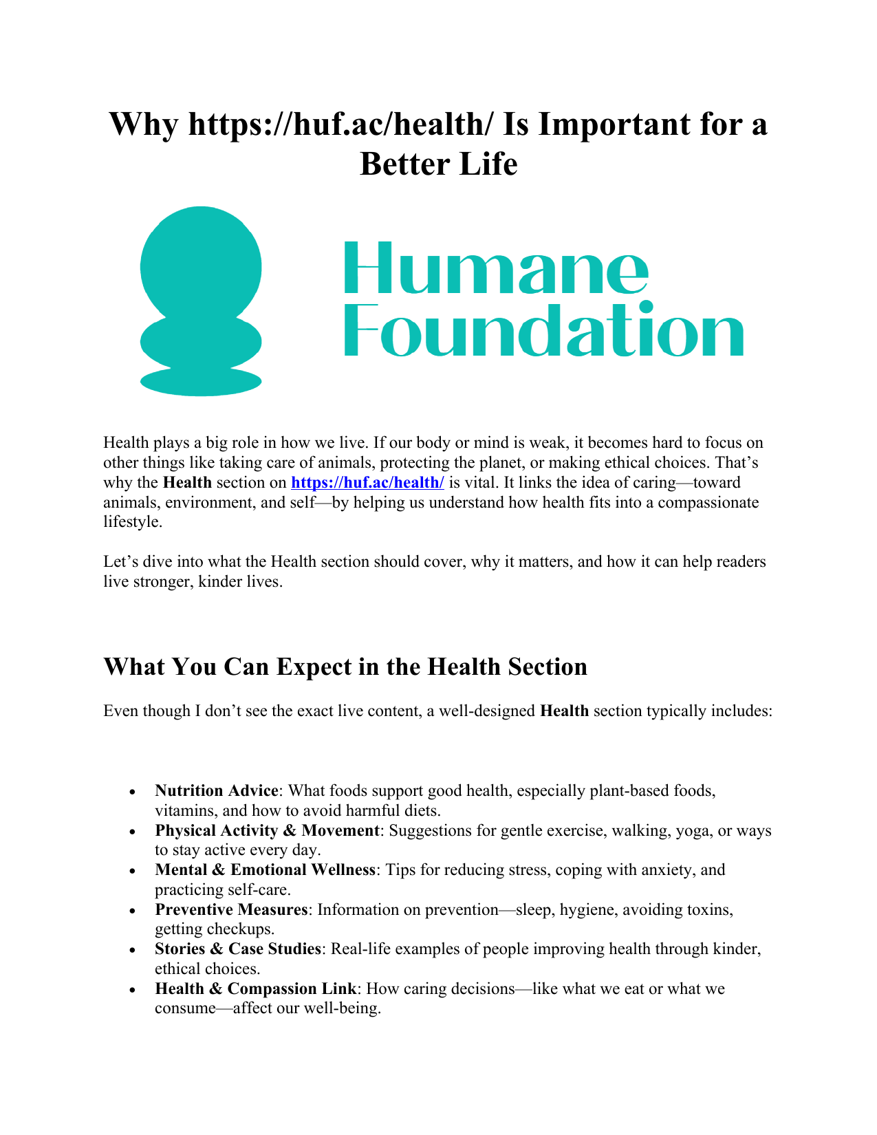Why https://huf.ac/health/ Is Important for a Better Life Health plays a big role in how we live. If our body or mind is weak, it becomes hard to focus on other things like taking care of animals, protecting the planet, or making ethical choices. That’s why the Health section on https://huf.ac/health/ is vital. It links the idea of caring—toward animals, environment, and self—by helping us understand how health fits into a compassionate lifestyle. Let’s dive into what the Health section should cover, why it matters, and how it can help readers live stronger, kinder lives. What You Can Expect in the Health Section Even though I don’t see the exact live content, a well-designed Health section typically includes: Nutrition Advice: What foods support good health, especially plant-based foods, vitamins, and how to avoid harmful diets. Physical Activity & Movement: Suggestions for gentle exercise, walking, yoga, or ways to stay active every day. Mental & Emotional Wellness: Tips for reducing stress, coping with anxiety, and practicing self-care. Preventive Measures: Information on prevention—sleep, hygiene, avoiding toxins, getting checkups. Stories & Case Studies: Real-life examples of people improving health through kinder, ethical choices. Health & Compassion Link: How caring decisions—like what we eat or what we consume—affect our well-being. With these elements, the Health section becomes more than just “how to stay well.” It shows how health is connected to our values. Why the Health Section Matters 1. Health Enables Action You can want to protect animals or the environment, but if your body or mind isn’t well, action becomes harder. Good health gives you strength, clarity, and energy. The Health section helps you build that foundation. 2. Ethical Health Choices Health and ethics often go side by side. For example, plant-based diets can support both personal health and animal welfare. The Health section can help you make choices that are good for both you and others. 3. Preventing Illness Through Better Living Many diseases today stem from sedentary lifestyle, processed food, stress, and pollution. The Health section can guide ways to prevent illness before it starts. That reduces suffering—not just for humans, but also less strain on healthcare systems and resources that affect the planet. 4. Mind & Body Connection Health is not just about the body. Our mental state matters too. Compassion, kindness, and purpose reduce stress and improve mental health. The Health section can give tips on mindfulness, emotional balance, and resilience. 5. Education & Empowerment Many health issues arise because people don’t know better options. The Health section educates in simple language so everyone—no matter their age—can understand. When people are informed, they make choices that benefit themselves and the world. How Readers Can Use the Health Section Start Small: Pick one tip—maybe eat more vegetables, sleep better, or meditate a few minutes. Track Progress: Write down small health goals and see improvements over weeks. Combine with Other Sections: Use lessons from Health along with Animals, Planet, and Lifestyle to build holistic growth. Share with Others: When you find a helpful tip, tell family or friends. That spreads kindness and health. Keep Learning: Revisit the Health section as your life changes (age, conditions, location). You will always find something new to apply. Challenges & How to Overcome Them Information Overload: Health has many opinions. The Health section should help filter out noise and show evidence-based practices. Resistance to Change: Some changes (food, habits) are hard. The section should encourage progress, not perfection. Balancing Health & Other Goals: Sometimes caring for animals or planet conflicts temporarily with ideal health. The section should help find balance, not guilt. Final Thoughts Health is more than “not being sick.” It is strength, clarity, resilience, and the ability to live ethically and joyfully. The Health section of https://huf.ac/ has the power to teach readers how caring choices—for animals, planet, and self—are deeply connected. By learning about nutrition, movement, mental wellness, and preventive care, people can become better equipped to live a life full of purpose and kindness. And when more people are well, together we can build a healthier and more compassionate world.