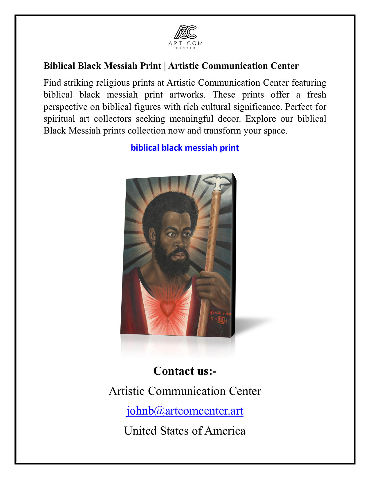 Biblical Black Messiah Print | Artistic Communication Center Find striking religious prints at Artistic Communication Center featuring biblical black messiah print artworks. These prints offer a fresh perspective on biblical figures with rich cultural significance. Perfect for spiritual art collectors seeking meaningful decor. Explore our biblical Black Messiah prints collection now and transform your space. biblical black messiah print Contact us:Artistic Communication Center [email protected] United States of America