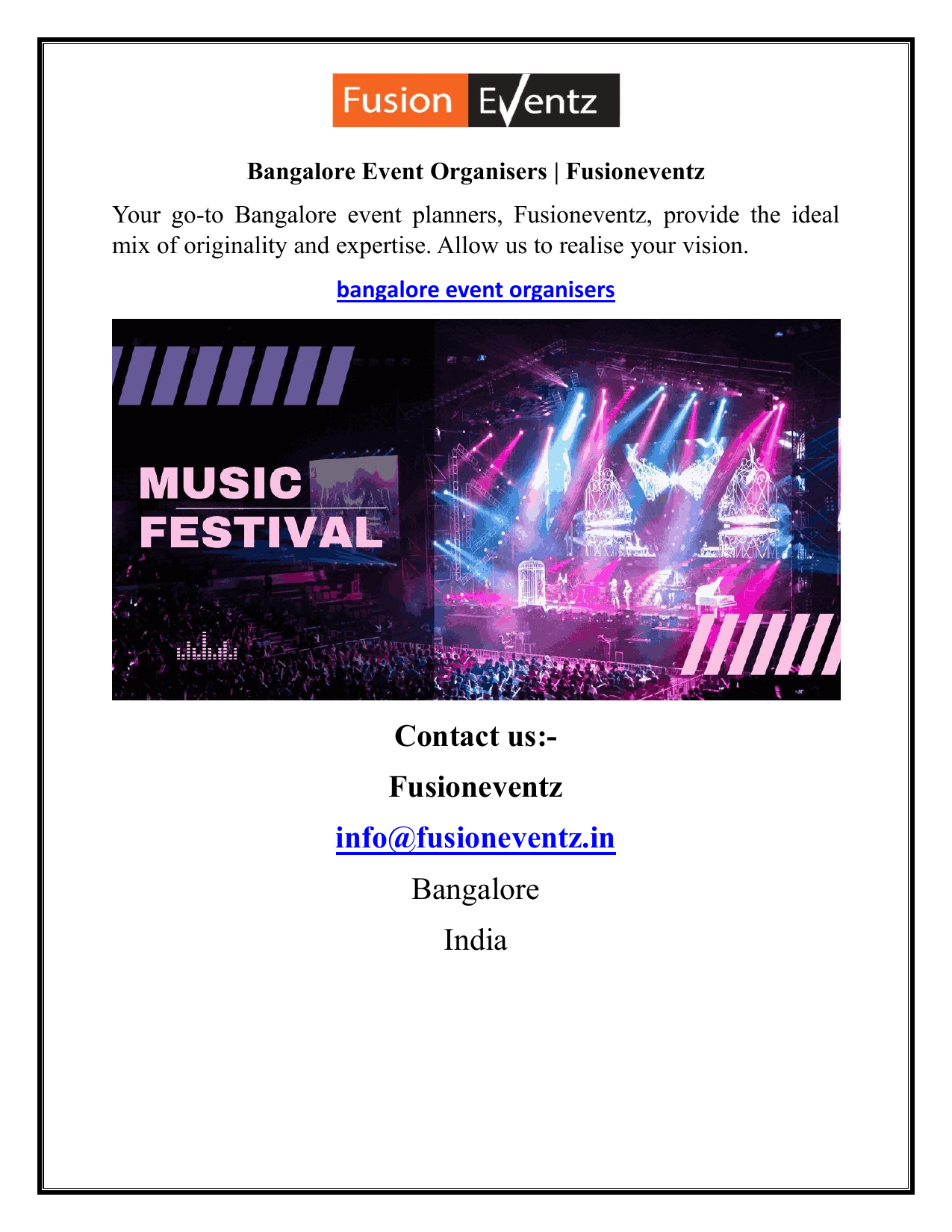 Bangalore Event Organisers | Fusioneventz Your go-to Bangalore event planners, Fusioneventz, provide the ideal mix of originality and expertise. Allow us to realise your vision. bangalore event organisers Contact us:Fusioneventz [email protected] Bangalore India