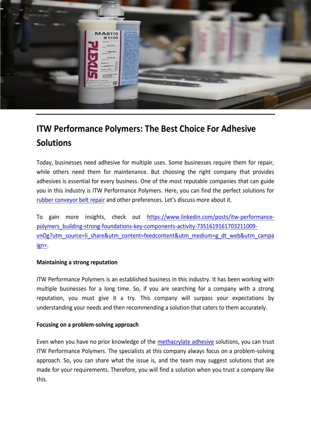 ITW Performance Polymers: The Best Choice For Adhesive Solutions Today, businesses need adhesive for multiple uses. Some businesses require them for repair, while others need them for maintenance. But choosing the right company that provides adhesives is essential for every business. One of the most reputable companies that can guide you in this industry is ITW Performance Polymers. Here, you can find the perfect solutions for rubber conveyor belt repair and other preferences. Let’s discuss more about it. To gain more insights, check out https://www.linkedin.com/posts/itw-performancepolymers_building-strong-foundations-key-components-activity-7351619161703211009vnOg?utm_source=li_share&utm_content=feedcontent&utm_medium=g_dt_web&utm_campa ign=. Maintaining a strong reputation ITW Performance Polymers is an established business in this industry. It has been working with multiple businesses for a long time. So, if you are searching for a company with a strong reputation, you must give it a try. This company will surpass your expectations by understanding your needs and then recommending a solution that caters to them accurately. Focusing on a problem-solving approach Even when you have no prior knowledge of the methacrylate adhesive solutions, you can trust ITW Performance Polymers. The specialists at this company always focus on a problem-solving approach. So, you can share what the issue is, and the team may suggest solutions that are made for your requirements. Therefore, you will find a solution when you trust a company like this. Paying attention to every little detail ITW Performance Polymers understands that businesses do not want to struggle with a product that does not meet their expectations. Therefore, the company pays attention to every little detail when providing adhesive solutions. You will find a product that offers great value at a cost-effective price. So, you will not have to compromise on anything when you choose this company. Offering exceptional customer service ITW Performance Polymers will provide you with the most suitable customer service based on your industry type. Different businesses work with this company for their needs every single time. The company builds long-lasting relationships with businesses and delivers the solutions they require with utmost Versatility. So, it can also be a great partner in your journey. Ensuring on-time work ITW Performance Polymers understands that time is of the essence for every business. Hence, when you choose this company, you will get your adhesive solutions on time without any delays. Even when there are any delays, the team will inform you about it well in advance. So, you can plan your work efficiently when you have such trusted professionals by your side. If you are looking for epoxy for aluminum, contact ITW Performance Polymers today. To get more details, visit https://itwperformancepolymers.com/ Contact: (978) 774-0516 Email: [email protected] Original Source: http://bit.ly/4gwKpE4