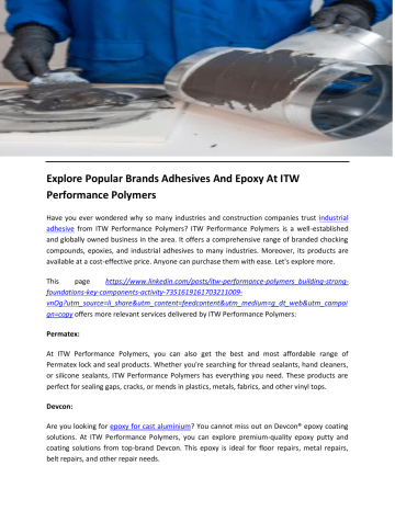 Explore Popular Brands Adhesives And Epoxy At ITW Performance Polymers Have you ever wondered why so many industries and construction companies trust industrial adhesive from ITW Performance Polymers? ITW Performance Polymers is a well-established and globally owned business in the area. It offers a comprehensive range of branded chocking compounds, epoxies, and industrial adhesives to many industries. Moreover, its products are available at a cost-effective price. Anyone can purchase them with ease. Let's explore more. This page https://www.linkedin.com/posts/itw-performance-polymers_building-strongfoundations-key-components-activity-7351619161703211009vnOg?utm_source=li_share&utm_content=feedcontent&utm_medium=g_dt_web&utm_campai gn=copy offers more relevant services delivered by ITW Performance Polymers: Permatex: At ITW Performance Polymers, you can also get the best and most affordable range of Permatex lock and seal products. Whether you're searching for thread sealants, hand cleaners, or silicone sealants, ITW Performance Polymers has everything you need. These products are perfect for sealing gaps, cracks, or mends in plastics, metals, fabrics, and other vinyl tops. Devcon: Are you looking for epoxy for cast aluminium? You cannot miss out on Devcon® epoxy coating solutions. At ITW Performance Polymers, you can explore premium-quality epoxy putty and coating solutions from top-brand Devcon. This epoxy is ideal for floor repairs, metal repairs, belt repairs, and other repair needs. Additionally, the experts at this platform use high-quality and ultra-fast adhesives and materials to create long-lasting epoxy products. They are water-resistant and available for various materials. Visit the organization today to discover a superior range of Devcon® epoxy. Spraycore: If you're searching for high-quality coating materials for composite industries, connecting with ITW Performance Polymers in the area is an ideal choice. It delivers premium-quality materials and coatings from the top brand Spraycore®. You can use such products for barrier coatings, plug buildings, sprayable fillers, and more. Plexus: Do you want durable bonding adhesives? If so, you never miss out on Plexus® structural adhesives. Visit ITW Performance Polymers to shop for the notch-quality, branded adhesives ideal for your industrial applications. These adhesives are perfect for bonding brackets and accessories, panels, and reinforcement bonds. Contact the experts at ITW Performance Polymers for more beneficial information and assistance for your bonding needs. In conclusion, ITW Performance Polymers is your go-to platform for all branded epoxy steel putty and industrial adhesive needs. At this company, you can find a diverse range of branded sealant materials all at an affordable price. To get more insights, check this out https://itwperformancepolymers.com/ Email: [email protected] Contact: (978) 774-0516 Original Source: http://bit.ly/3Vpitbu