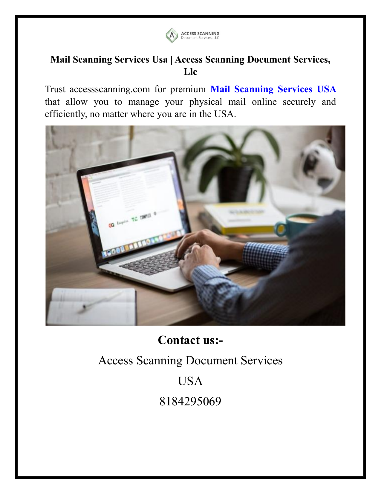 Mail Scanning Services Usa | Access Scanning Document Services, Llc Trust accessscanning.com for premium Mail Scanning Services USA that allow you to manage your physical mail online securely and efficiently, no matter where you are in the USA. Contact us:Access Scanning Document Services USA 8184295069