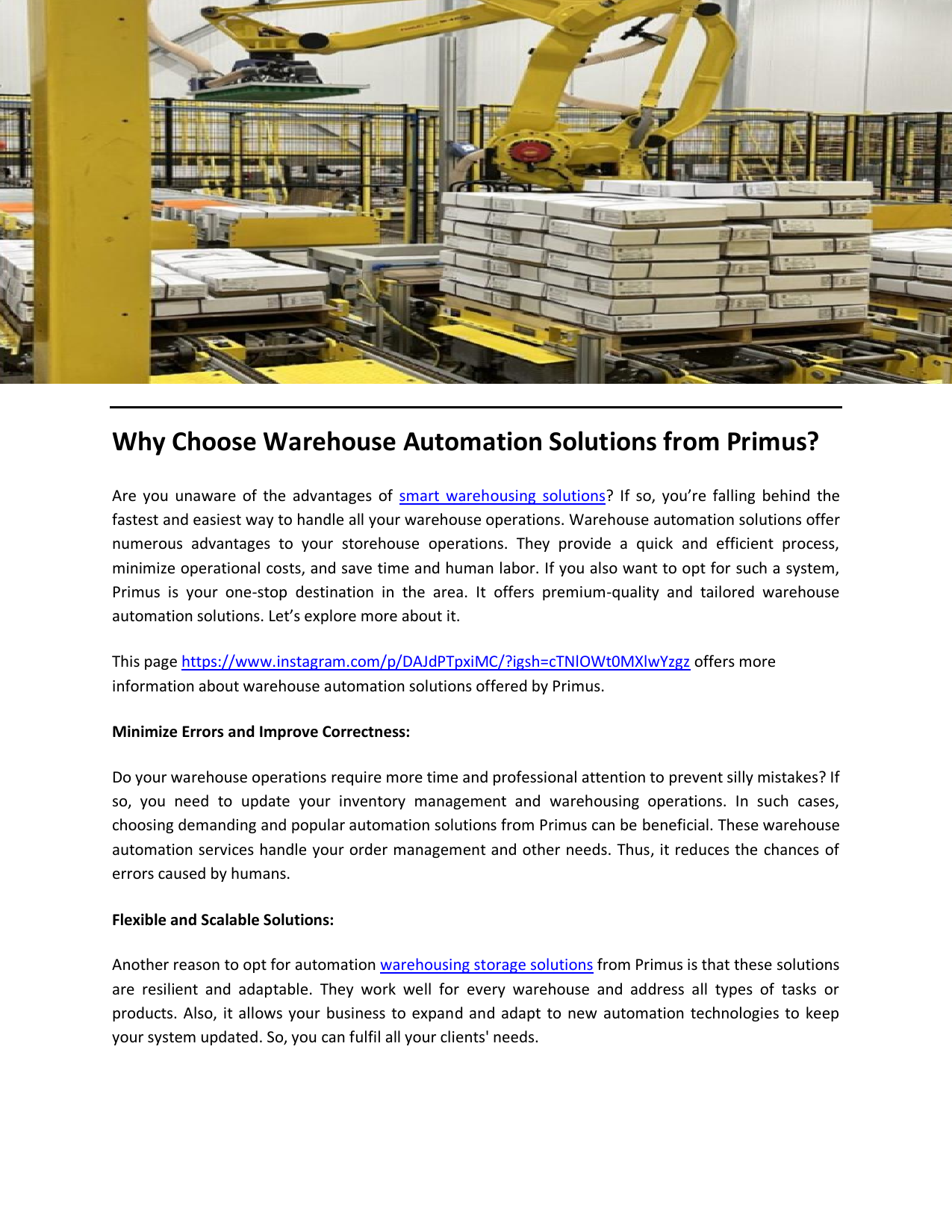 Why Choose Warehouse Automation Solutions from Primus? Are you unaware of the advantages of smart warehousing solutions? If so, you’re falling behind the fastest and easiest way to handle all your warehouse operations. Warehouse automation solutions offer numerous advantages to your storehouse operations. They provide a quick and efficient process, minimize operational costs, and save time and human labor. If you also want to opt for such a system, Primus is your one-stop destination in the area. It offers premium-quality and tailored warehouse automation solutions. Let’s explore more about it. This page https://www.instagram.com/p/DAJdPTpxiMC/?igsh=cTNlOWt0MXlwYzgz offers more information about warehouse automation solutions offered by Primus. Minimize Errors and Improve Correctness: Do your warehouse operations require more time and professional attention to prevent silly mistakes? If so, you need to update your inventory management and warehousing operations. In such cases, choosing demanding and popular automation solutions from Primus can be beneficial. These warehouse automation services handle your order management and other needs. Thus, it reduces the chances of errors caused by humans. Flexible and Scalable Solutions: Another reason to opt for automation warehousing storage solutions from Primus is that these solutions are resilient and adaptable. They work well for every warehouse and address all types of tasks or products. Also, it allows your business to expand and adapt to new automation technologies to keep your system updated. So, you can fulfil all your clients' needs. Enhance Productiveness and Efficiency: Automation solutions keep your warehouse operations running smoothly and efficiently. It saves more time while packing and sorting goods and tackles every order with more efficiency. Choose such automation systems from Primus. It offers the best and most affordable automation solutions that suit your warehousing needs. Better Utilization of Resources and Saves Money: Lastly, automation solutions can save more money in the long run. It also eliminated the need for labor by automating more work using computing and machines. This can significantly reduce waste in your store homes, allow employees to pack the order in the correct way, and also extend the lifespan of the tools. As all such things are generated and packaged using warehouse automation solutions. Choose such premium solutions from professional companies, like Primus. It provides secure and costeffective services that suit your warehousing needs. In conclusion, choosing the warehouse automation solutions from Primus can be beneficial for your storehouse in the long run. To get more information, visit https://www.primusbuilders.com/ Email: [email protected] Contact: 770.928.7120 Original Source: https://bit.ly/4gTnIKk