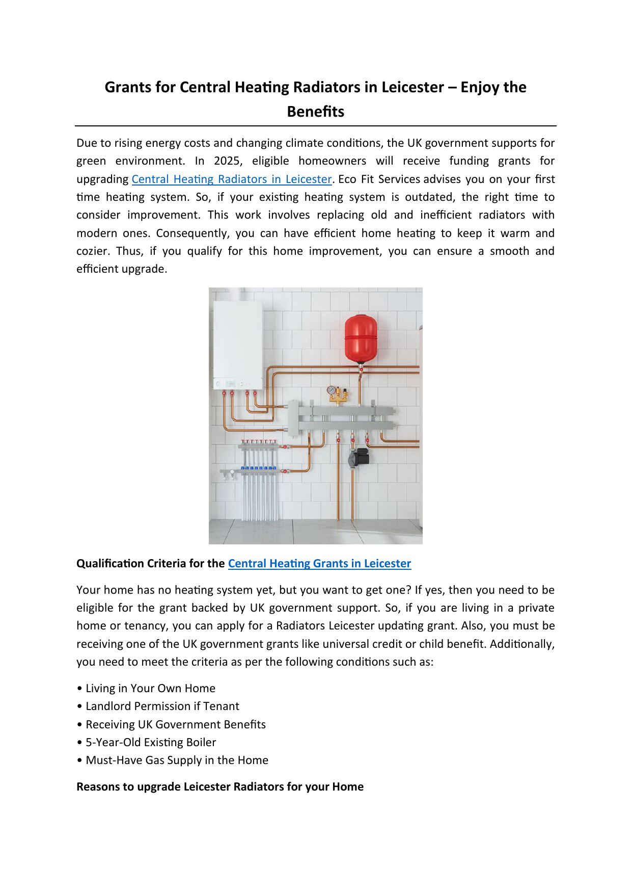 Grants for Central Heating Radiators in Leicester – Enjoy the Benefits Due to rising energy costs and changing climate conditions, the UK government supports for green environment. In 2025, eligible homeowners will receive funding grants for upgrading Central Heating Radiators in Leicester. Eco Fit Services advises you on your first time heating system. So, if your existing heating system is outdated, the right time to consider improvement. This work involves replacing old and inefficient radiators with modern ones. Consequently, you can have efficient home heating to keep it warm and cozier. Thus, if you qualify for this home improvement, you can ensure a smooth and efficient upgrade. Qualification Criteria for the Central Heating Grants in Leicester Your home has no heating system yet, but you want to get one? If yes, then you need to be eligible for the grant backed by UK government support. So, if you are living in a private home or tenancy, you can apply for a Radiators Leicester updating grant. Also, you must be receiving one of the UK government grants like universal credit or child benefit. Additionally, you need to meet the criteria as per the following conditions such as: • Living in Your Own Home • Landlord Permission if Tenant • Receiving UK Government Benefits • 5-Year-Old Existing Boiler • Must-Have Gas Supply in the Home Reasons to upgrade Leicester Radiators for your Home Grants are available to refurbish central heating systems including radiators. So, if your home doesn’t have this system, you should seek grants to cover upfront costs. This particularly reduces heating expenses for your home, especially if you have a low income. Here are the reasons to consider this upgrade. • Improved Energy-efficiency Modern systems are efficient as they are designed with advanced technology. So, upgrading radiators of central heating systems effectively distributes and retains heat to minimise energy wastage. You can further pair these systems with smart controls to gain efficiency of use. Consequently, it can significantly lower your monthly energy consumption bills. • Less Space Coverage Modern-day central heating systems are far better than conventional systems, which take lot of room. Nowadays, you can find Designer Radiators Leicester, which are more stylish and functional to serve the purpose of heating. They are quieter and smaller in size, which keeps your house heated during winters efficiently and smartly. • Have Controlled Function You can seek grants for Leicester Central Heating Radiators, which are designed to offer controlled function. They are easily adjustable to various temperature levels to distribute heating across your residential building. Even they have combined controls through smart thermostats and smartphone technology. Also, modern radiator valves can increase the efficiency of boilers. Contact Eco Fit Services Today for Leicester Radiators You can connect with sustainable home heating improvement schemes through us. If you are fulfilling the eligibility criteria, you can apply for the ECO scheme to upgrade the central heating system. This enables you to have a comfortable living in your home and make it worth it. Our comprehensive guide helps you navigate the procedure to apply for a grant for improved heating of your home.