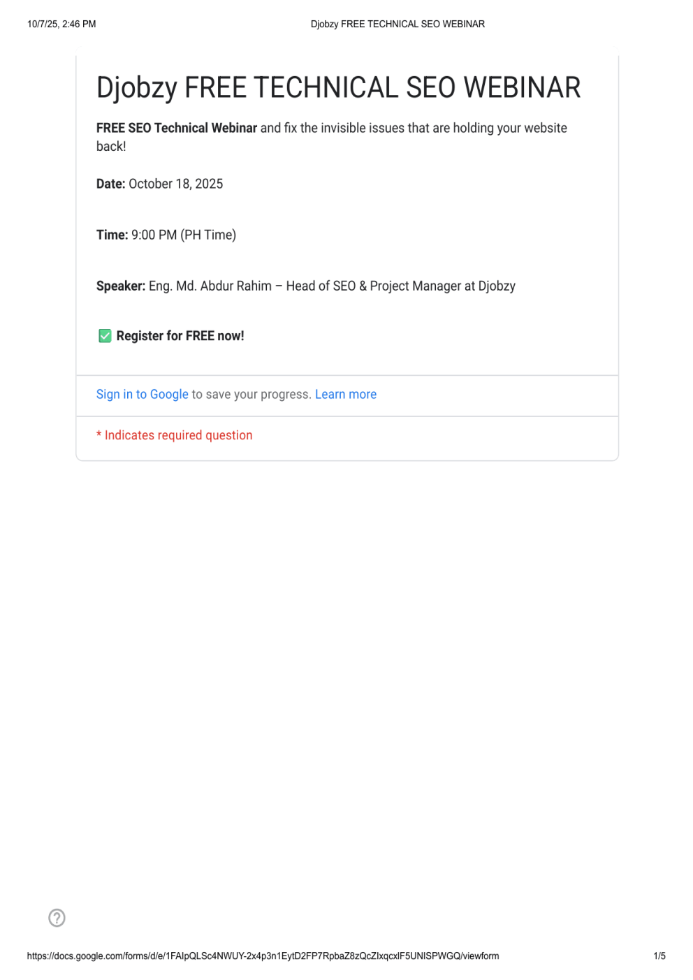 10/7/25, 2:46 PM Djobzy FREE TECHNICAL SEO WEBINAR Djobzy FREE TECHNICAL SEO WEBINAR FREE SEO Technical Webinar and fix the invisible issues that are holding your website back! Date: October 18, 2025 Time: 9:00 PM (PH Time) Speaker: Eng. Md. Abdur Rahim – Head of SEO & Project Manager at Djobzy ✅ Register for FREE now! Sign in to Google to save your progress. Learn more * Indicates required question https://docs.google.com/forms/d/e/1FAIpQLSc4NWUY-2x4p3n1EytD2FP7RpbaZ8zQcZIxqcxlF5UNISPWGQ/viewform 1/5 10/7/25, 2:46 PM Djobzy FREE TECHNICAL SEO WEBINAR Full Name * Your answer Email Address * Your answer https://docs.google.com/forms/d/e/1FAIpQLSc4NWUY-2x4p3n1EytD2FP7RpbaZ8zQcZIxqcxlF5UNISPWGQ/viewform 2/5 10/7/25, 2:46 PM Djobzy FREE TECHNICAL SEO WEBINAR Phone number * Your answer Location / Country * Your answer Current Role / Industry * Your answer How did you hear about this webinar? * Your answer What do you expect to learn about Technical SEO? * Your answer https://docs.google.com/forms/d/e/1FAIpQLSc4NWUY-2x4p3n1EytD2FP7RpbaZ8zQcZIxqcxlF5UNISPWGQ/viewform 3/5 10/7/25, 2:46 PM Djobzy FREE TECHNICAL SEO WEBINAR Thank you for registering for the Djobzy FREE SEO Technical Webinar! Stay tuned to our Facebook Page https://www.facebook.com/Djobzy for updates and announcements about the webinar. See you on October 18, 2025, at 9:00 PM (PH Time)! https://www.philippines.djobzy.com Basement Unit 2, Lagura Building Beside Dontattoo, Barangay 1 Magsaysay Street, Malaybalay City 8700 Bukidnon, Philippines +63993-437-6874 Submit Clear form Never submit passwords through Google Forms. This form was created inside of Djobzy. Does this form look suspicious? Report Forms https://docs.google.com/forms/d/e/1FAIpQLSc4NWUY-2x4p3n1EytD2FP7RpbaZ8zQcZIxqcxlF5UNISPWGQ/viewform 4/5 10/7/25, 2:46 PM Djobzy FREE TECHNICAL SEO WEBINAR https://docs.google.com/forms/d/e/1FAIpQLSc4NWUY-2x4p3n1EytD2FP7RpbaZ8zQcZIxqcxlF5UNISPWGQ/viewform 5/5