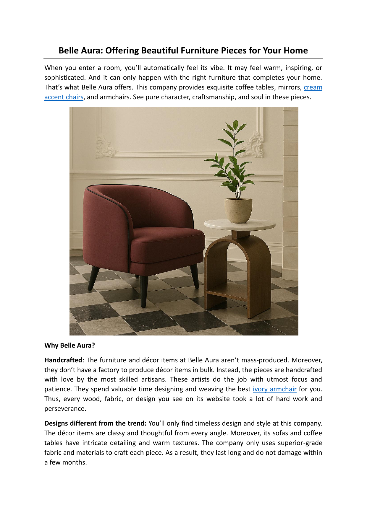 Belle Aura: Offering Beautiful Furniture Pieces for Your Home When you enter a room, you’ll automatically feel its vibe. It may feel warm, inspiring, or sophisticated. And it can only happen with the right furniture that completes your home. That’s what Belle Aura offers. This company provides exquisite coffee tables, mirrors, cream accent chairs, and armchairs. See pure character, craftsmanship, and soul in these pieces. Why Belle Aura? Handcrafted: The furniture and décor items at Belle Aura aren’t mass-produced. Moreover, they don’t have a factory to produce décor items in bulk. Instead, the pieces are handcrafted with love by the most skilled artisans. These artists do the job with utmost focus and patience. They spend valuable time designing and weaving the best ivory armchair for you. Thus, every wood, fabric, or design you see on its website took a lot of hard work and perseverance. Designs different from the trend: You’ll only find timeless design and style at this company. The décor items are classy and thoughtful from every angle. Moreover, its sofas and coffee tables have intricate detailing and warm textures. The company only uses superior-grade fabric and materials to craft each piece. As a result, they last long and do not damage within a few months. Choose your furniture or décor piece Firstly, you need to understand your vibe to choose the correct furniture. Do you want a rustic and cozy room? Or do you gravitate more toward sleek or earthy furniture? In any case, you can find furniture or décor at Belle Aura to match your aesthetics. You can choose an aesthetic coffee table, an earthy end table, or sectional sofas. Visit its official website and explore the available categories. Each piece comes with a purpose Do you ever look at a coffee table in a furniture store and think it’s worthless? If so, think again! It is a piece that has seen your laughter and heard conversations. It is also where you place your snacks and other stuff. Sometimes, your kids play or study around this table. Similarly, Belle Aura offers tables, sofas, and other furniture with a purpose. You’ll undoubtedly see a positive change in your room with these pieces. Add a personality to the room You don’t need to copy the trend or settle for a single piece of furniture. Instead, get a mix of Calacatta coffee table, decorative mirror, and sofa from Belle Aura. This practice will add a unique personality to your room. To get more details, visit https://belleaura.com/ Original source: https://bit.ly/46PxWbs