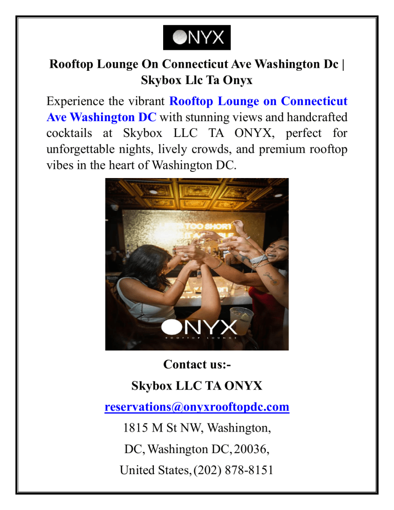 Rooftop Lounge On Connecticut Ave Washington Dc | Skybox Llc Ta Onyx Experience the vibrant Rooftop Lounge on Connecticut Ave Washington DC with stunning views and handcrafted cocktails at Skybox LLC TA ONYX, perfect for unforgettable nights, lively crowds, and premium rooftop vibes in the heart of Washington DC. Contact us:Skybox LLC TA ONYX [email protected] 1815 M St NW, Washington, DC, Washington DC, 20036, United States, (202) 878-8151