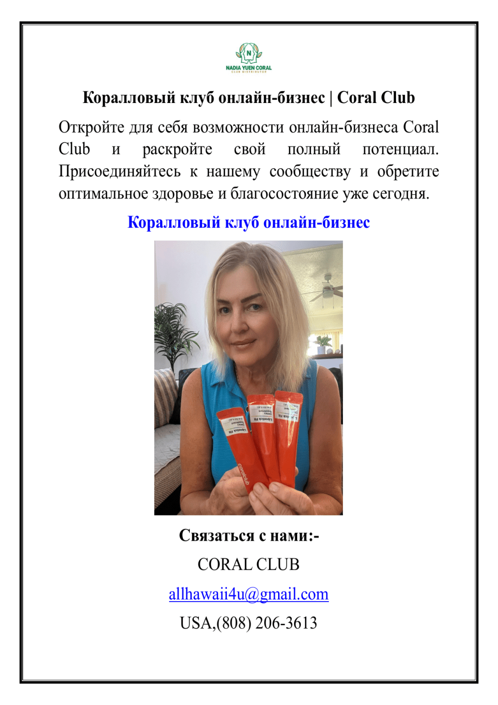 Коралловый клуб онлайн-бизнес | Coral Club Откройте для себя возможности онлайн-бизнеса Coral Club и раскройте свой полный потенциал. Присоединяйтесь к нашему сообществу и обретите оптимальное здоровье и благосостояние уже сегодня. Коралловый клуб онлайн-бизнес Связаться с нами:CORAL CLUB [email protected] USA,(808) 206-3613