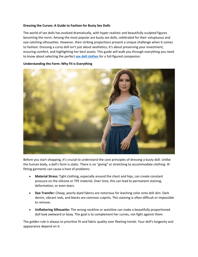 Dressing the Curves: A Guide to Fashion for Busty Sex Dolls The world of sex dolls has evolved dramatically, with hyper-realistic and beautifully sculpted figures becoming the norm. Among the most popular are busty sex dolls, celebrated for their voluptuous and eye-catching silhouettes. However, their striking proportions present a unique challenge when it comes to fashion. Dressing a curvy doll isn't just about aesthetics; it's about preserving your investment, ensuring comfort, and highlighting her best assets. This guide will walk you through everything you need to know about selecting the perfect sex doll clothes for a full-figured companion. Understanding the Form: Why Fit is Everything Before you start shopping, it's crucial to understand the core principles of dressing a busty doll. Unlike the human body, a doll's form is static. There is no "giving" or stretching to accommodate clothing. Illfitting garments can cause a host of problems: Material Stress: Tight clothing, especially around the chest and hips, can create constant pressure on the silicone or TPE material. Over time, this can lead to permanent staining, deformation, or even tears. Dye Transfer: Cheap, poorly dyed fabrics are notorious for leaching color onto doll skin. Dark denim, vibrant reds, and blacks are common culprits. This staining is often difficult or impossible to remove. Unflattering Silhouette: The wrong neckline or waistline can make a beautifully proportioned doll look awkward or boxy. The goal is to complement her curves, not fight against them. The golden rule is always to prioritize fit and fabric quality over fleeting trends. Your doll's longevity and appearance depend on it. The Foundation: Mastering Tops and Necklines This is the most critical category for a busty sex doll. The right top can be stunning; the wrong one can be a disaster. What to Look For: V-Necks and Scoop Necks: These are universally flattering choices. They elongate the torso and draw the eye vertically, balancing the bustline without constricting it. Wrap-Style Tops and Dresses: Designs that tie or wrap at the waist are ideal. They allow for adjustable fit through the bust while cinching at the smallest part of the waist to accentuate her hourglass figure. Stretchy, Soft Fabrics: Jersey knit, cotton spandex, and soft modal are your best friends. These materials have enough give to slide over the bust without applying excessive pressure. Always ensure the stretch is horizontal (across the body) to accommodate her curves. What to Avoid: High, Tight Necklines: Turtlenecks and tight crewnecks can make the bust appear even larger and create a stuffed, uncomfortable look. They are also difficult to get on and off. Rigid, Non-Stretch Materials: Avoid stiff cottons, heavy brocades, or structured blazers that aren't specifically designed for dolls. They will simply not close or will distort the doll's shape. Horizontal Stripes: While not a hard rule, horizontal stripes can exaggerate width. If you love stripes, opt for thinner lines or pair a striped bottom with a solid, dark top. Bottoms and Dresses: Balancing the Silhouette The key to a harmonious look is balancing the voluminous top half with the lower half. Choosing the Right Bottoms: High-Waisted Styles: High-waisted jeans, skirts, and shorts are perfect for busty dolls. They help define the waist and create a seamless, flowing line from the bust down through the hips. A-Line Skirts and Dresses: This cut is a classic for a reason. It fits snugly at the waist and then flares out, complementing the bust and hips beautifully without adding bulk. Stretchy Waistbands: Like with tops, flexibility is key. Elasticated waists or tie closures ensure a comfortable and secure fit around the hips and waist. The Full Look: Dresses When shopping for dresses, look for the same features: stretchy fabric, a defined waist (either through tailoring or a belt), and a flattering neckline. Bodycon dresses can look incredible but must be made from a high-quality, thick spandex that won't thin out over the curves. Fabric Care and Practical Dressing Tips Protecting your doll should be your top priority when choosing sex doll clothes. 1. Pre-Wash Everything: Always wash new clothing before putting it on your doll. Use a gentle, dye-free detergent and avoid fabric softeners. This removes excess dyes and chemicals that could transfer to the doll's skin. 2. The Inside-Out Test: Rub the inside of a garment (especially dark-colored ones) against a small, inconspicuous area of the doll, like the sole of a foot. If any color comes off, do not use it. 3. Dress with Care: Be patient when dressing your doll. Avoid pulling or stretching garments over sharp fingernails or jewelry that could puncture the material. For especially tight outfits, using a dressing aid like talcum powder (for TPE) or a silicone-based lubricant (for silicone) on the limbs can help clothing slide on smoothly. 4. Specialized Retailers: The best option is to shop from retailers that specialize in sex doll clothes. These stores design their garments with a doll's specific proportions and material sensitivities in mind, taking the guesswork out of finding the right fit. Dressing a busty sex doll is a creative and rewarding endeavor. By focusing on fit, fabric, and flattering styles, you can build a stunning wardrobe that celebrates her curves, protects your valuable companion, and showcases your unique sense of style. Web:- https://tenderdolls.com/ #sexdollclothes, #bustysexdoll