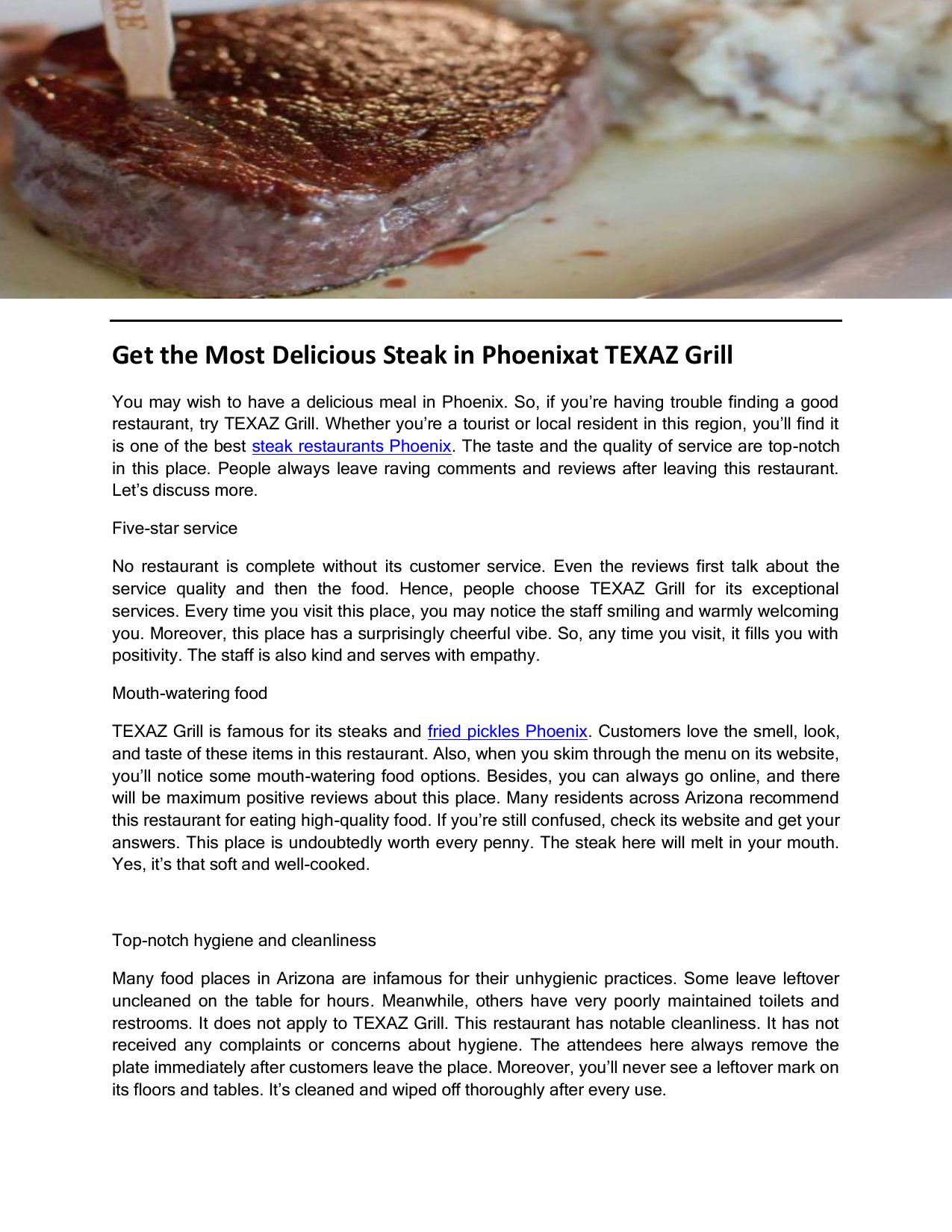 Get the Most Delicious Steak in Phoenixat TEXAZ Grill You may wish to have a delicious meal in Phoenix. So, if you’re having trouble finding a good restaurant, try TEXAZ Grill. Whether you’re a tourist or local resident in this region, you’ll find it is one of the best steak restaurants Phoenix. The taste and the quality of service are top-notch in this place. People always leave raving comments and reviews after leaving this restaurant. Let’s discuss more. Five-star service No restaurant is complete without its customer service. Even the reviews first talk about the service quality and then the food. Hence, people choose TEXAZ Grill for its exceptional services. Every time you visit this place, you may notice the staff smiling and warmly welcoming you. Moreover, this place has a surprisingly cheerful vibe. So, any time you visit, it fills you with positivity. The staff is also kind and serves with empathy. Mouth-watering food TEXAZ Grill is famous for its steaks and fried pickles Phoenix. Customers love the smell, look, and taste of these items in this restaurant. Also, when you skim through the menu on its website, you’ll notice some mouth-watering food options. Besides, you can always go online, and there will be maximum positive reviews about this place. Many residents across Arizona recommend this restaurant for eating high-quality food. If you’re still confused, check its website and get your answers. This place is undoubtedly worth every penny. The steak here will melt in your mouth. Yes, it’s that soft and well-cooked. Top-notch hygiene and cleanliness Many food places in Arizona are infamous for their unhygienic practices. Some leave leftover uncleaned on the table for hours. Meanwhile, others have very poorly maintained toilets and restrooms. It does not apply to TEXAZ Grill. This restaurant has notable cleanliness. It has not received any complaints or concerns about hygiene. The attendees here always remove the plate immediately after customers leave the place. Moreover, you’ll never see a leftover mark on its floors and tables. It’s cleaned and wiped off thoroughly after every use. Amazing drinks are also available here If you’re planning to skip TEXAZ Grill, assuming there are no drinks, you’re probably wrong. This restaurant has a well-crafted menu of handcrafted beverages. It also offers premium and local brews in their finest quality. So, if you’re anywhere in Arizona, you may want to visit one of the best Phoenix Arizona steakhouse restaurants for drinks and food. To get more details, visit https://texazgrill.com/ Original Source: https://bit.ly/3J7E05P