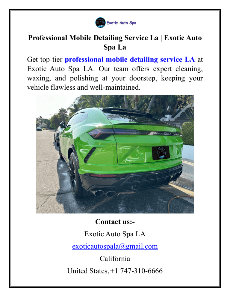 Professional Mobile Detailing Service La | Exotic Auto Spa La Get top-tier professional mobile detailing service LA at Exotic Auto Spa LA. Our team offers expert cleaning, waxing, and polishing at your doorstep, keeping your vehicle flawless and well-maintained. Contact us:Exotic Auto Spa LA [email protected] California United States, +1 747-310-6666