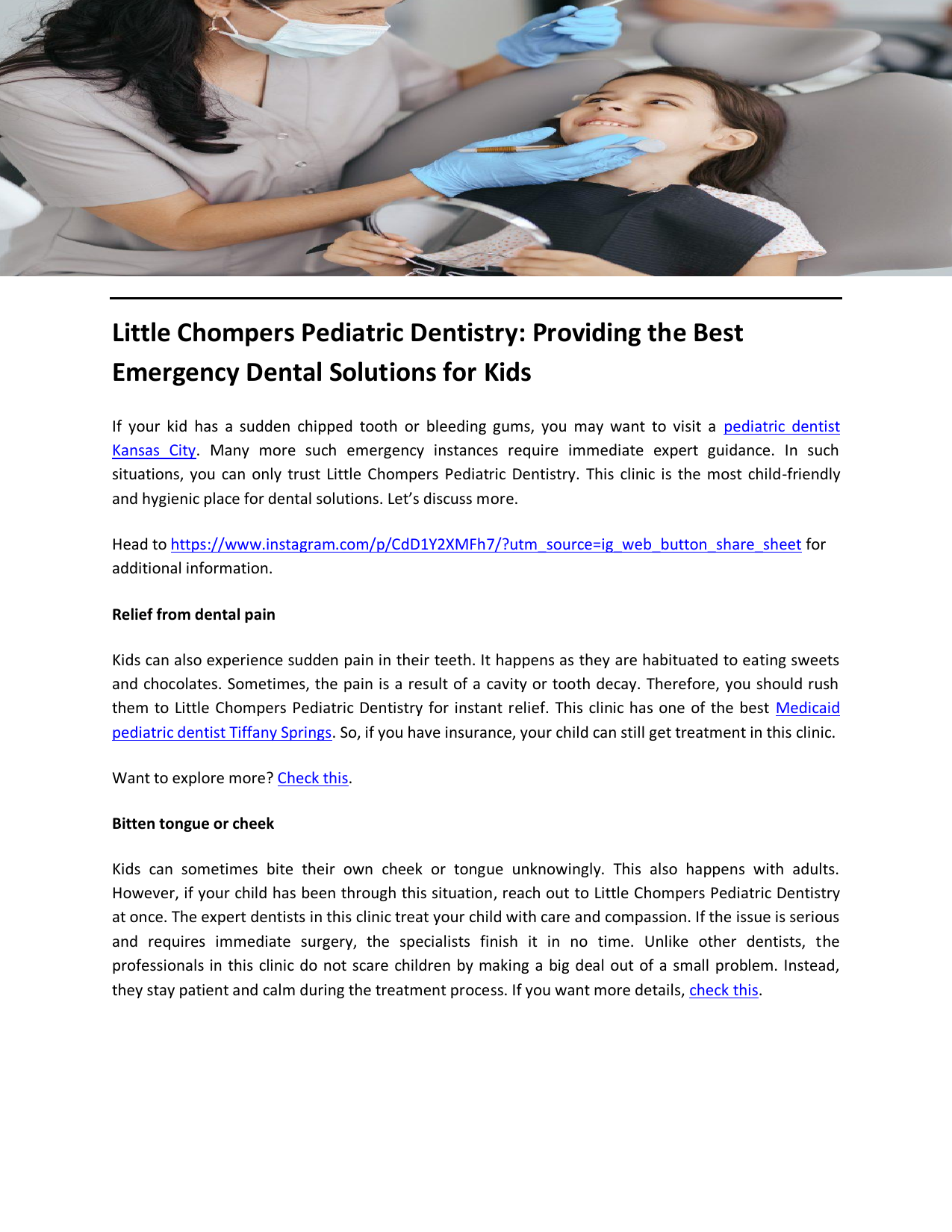 Little Chompers Pediatric Dentistry: Providing the Best Emergency Dental Solutions for Kids If your kid has a sudden chipped tooth or bleeding gums, you may want to visit a pediatric dentist Kansas City. Many more such emergency instances require immediate expert guidance. In such situations, you can only trust Little Chompers Pediatric Dentistry. This clinic is the most child-friendly and hygienic place for dental solutions. Let’s discuss more. Head to https://www.instagram.com/p/CdD1Y2XMFh7/?utm_source=ig_web_button_share_sheet for additional information. Relief from dental pain Kids can also experience sudden pain in their teeth. It happens as they are habituated to eating sweets and chocolates. Sometimes, the pain is a result of a cavity or tooth decay. Therefore, you should rush them to Little Chompers Pediatric Dentistry for instant relief. This clinic has one of the best Medicaid pediatric dentist Tiffany Springs. So, if you have insurance, your child can still get treatment in this clinic. Want to explore more? Check this. Bitten tongue or cheek Kids can sometimes bite their own cheek or tongue unknowingly. This also happens with adults. However, if your child has been through this situation, reach out to Little Chompers Pediatric Dentistry at once. The expert dentists in this clinic treat your child with care and compassion. If the issue is serious and requires immediate surgery, the specialists finish it in no time. Unlike other dentists, the professionals in this clinic do not scare children by making a big deal out of a small problem. Instead, they stay patient and calm during the treatment process. If you want more details, check this. Efficient dental care advice for infants and toddlers Do you see a tooth emerging in your toddler’s mouth? If so, it is the right time to start caring for them. Hence, many parents in and around Kansas City trust Little Chompers Pediatric Dentistry. The dentist in this clinic offers some realistic and effective dental care advice for infants and toddlers. Moreover, it is not even a tiring process to follow their suggestions and care for your kid’s teeth. Following the experts in this clinic will eliminate the possibility of cavity formation for your child at a young age. Lastly, the one significant reason to choose Little Chompers Pediatric Dentistry is that you can trust the professionals here with your child. Moreover, the best Northland kids dentist in this clinic guides parents in taking efficient dental care of their kids. To get more details, visit https://littlechomperspd.com Contact: (913) 290-5070 Original Source: https://bit.ly/4nfYDLr