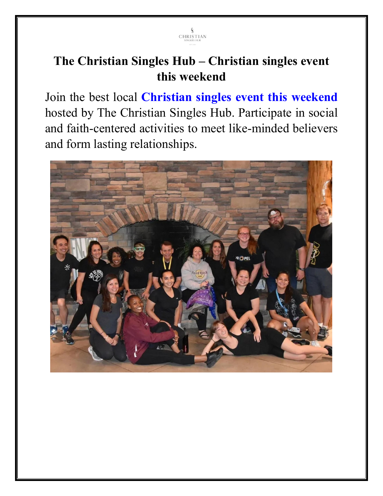 The Christian Singles Hub – Christian singles event this weekend Join the best local Christian singles event this weekend hosted by The Christian Singles Hub. Participate in social and faith-centered activities to meet like-minded believers and form lasting relationships.