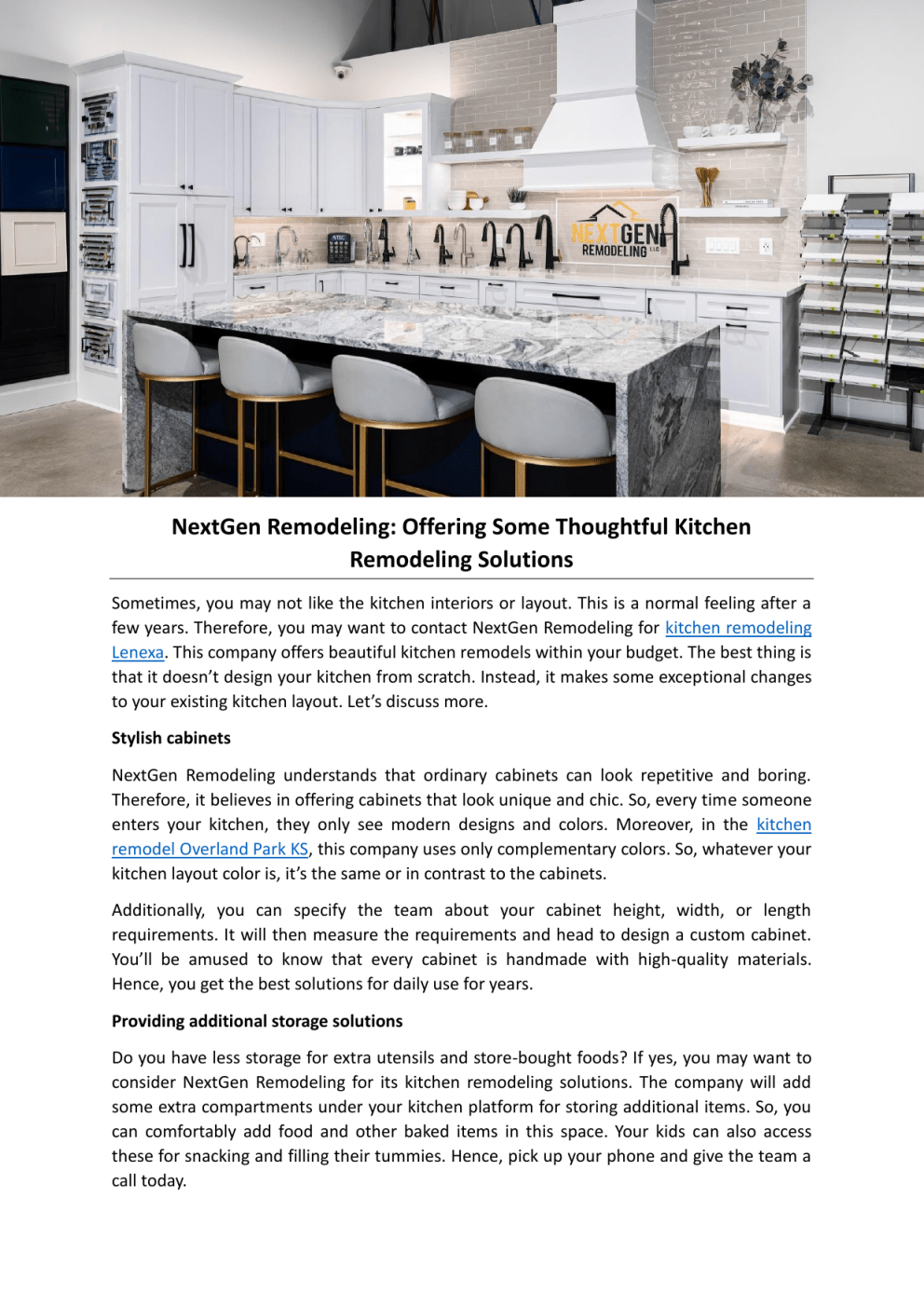 NextGen Remodeling: Offering Some Thoughtful Kitchen Remodeling Solutions Sometimes, you may not like the kitchen interiors or layout. This is a normal feeling after a few years. Therefore, you may want to contact NextGen Remodeling for kitchen remodeling Lenexa. This company offers beautiful kitchen remodels within your budget. The best thing is that it doesn’t design your kitchen from scratch. Instead, it makes some exceptional changes to your existing kitchen layout. Let’s discuss more. Stylish cabinets NextGen Remodeling understands that ordinary cabinets can look repetitive and boring. Therefore, it believes in offering cabinets that look unique and chic. So, every time someone enters your kitchen, they only see modern designs and colors. Moreover, in the kitchen remodel Overland Park KS, this company uses only complementary colors. So, whatever your kitchen layout color is, it’s the same or in contrast to the cabinets. Additionally, you can specify the team about your cabinet height, width, or length requirements. It will then measure the requirements and head to design a custom cabinet. You’ll be amused to know that every cabinet is handmade with high-quality materials. Hence, you get the best solutions for daily use for years. Providing additional storage solutions Do you have less storage for extra utensils and store-bought foods? If yes, you may want to consider NextGen Remodeling for its kitchen remodeling solutions. The company will add some extra compartments under your kitchen platform for storing additional items. So, you can comfortably add food and other baked items in this space. Your kids can also access these for snacking and filling their tummies. Hence, pick up your phone and give the team a call today. Remodeling the kitchen countertops When you first construct the home, you usually don’t have an idea of the kitchen countertops. You may not understand which material is better or worse for a kitchen space. Maybe you’ve installed a low-quality, conventional countertop or worktop. NextGen Remodeling can help remodel it. This company offers contacts to some reliable and renowned countertop sellers in Kansas City. If required, it also brings them to your home for a quick discussion or consultation. Hence, there is no requirement for juggling contractors or worktop companies. The team also hires workers to install the new countertops and remove the existing ones. So, if you’re hunting for a capable company for kitchen remodeling Leawood, nothing beats NextGen Remodeling. This company also offers affordable and modern bathroom and basement remodeling solutions. Want a kitchen in your basement? Consider it done with this experienced team. To get more details, visit https://nextgenkc.com/ Original Source: https://bit.ly/3KRa0f2
