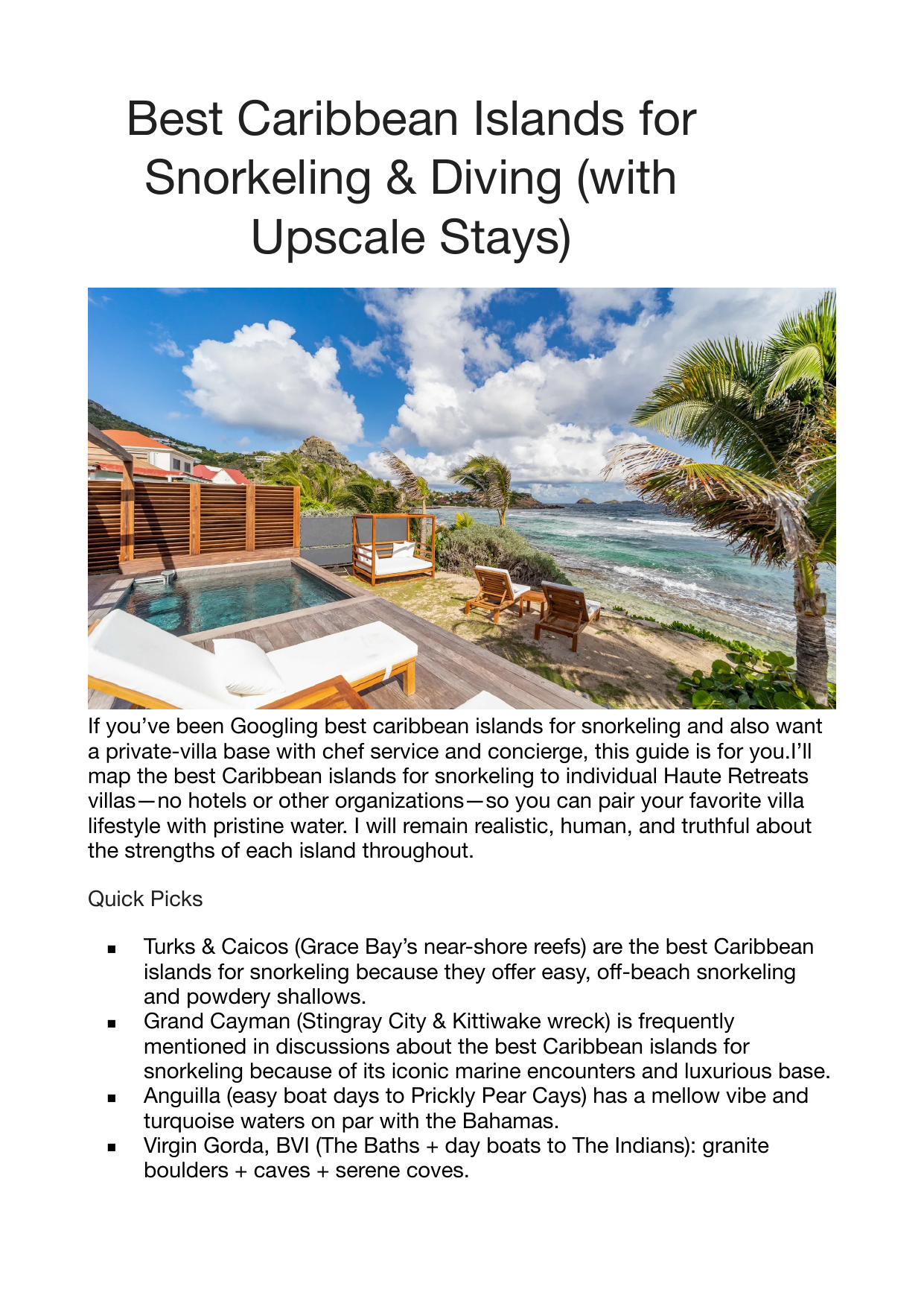 Best Caribbean Islands for Snorkeling & Diving (with Upscale Stays) If you’ve been Googling best caribbean islands for snorkeling and also want a private-villa base with chef service and concierge, this guide is for you.I’ll map the best Caribbean islands for snorkeling to individual Haute Retreats villas—no hotels or other organizations—so you can pair your favorite villa lifestyle with pristine water. I will remain realistic, human, and truthful about the strengths of each island throughout. Quick Picks ▪ Turks & Caicos (Grace Bay’s near-shore reefs) are the best Caribbean ▪ ff ▪ ff ▪ islands for snorkeling because they o er easy, o -beach snorkeling and powdery shallows. Grand Cayman (Stingray City & Kittiwake wreck) is frequently mentioned in discussions about the best Caribbean islands for snorkeling because of its iconic marine encounters and luxurious base. Anguilla (easy boat days to Prickly Pear Cays) has a mellow vibe and turquoise waters on par with the Bahamas. Virgin Gorda, BVI (The Baths + day boats to The Indians): granite boulders + caves + serene coves. ▪ The Exumas, Bahamas (Exuma Cays Land & Sea Park) has sandbars and a protected marine park. ▪ Barbados, which has mild west coast waters, is home to turtles o the Platinum Coast. ▪ Turtle-friendly coves: St. Barts (or, on calm days, Colombian and Petite Anse). Note: To ensure smooth and private planning, each location below is exclusively covered by Haute Retreats villas and concierge services. How We Chose To keep this focused on best caribbean islands for snorkeling, I weighted: ▪ Access to nearshore snorkeling areas (protected coves, house reefs): 30% ▪ 25% of water clarity plus the usual sea condition, particularly in the winter and spring ▪ Variety (20%): reefs, wrecks, rays, and turtles ▪ 20% of the Haute Retreats villa inventory is of high quality (privacy, chef options, and service). ▪ Hurricane belt and seasonality variables: 5% The end product is a concise list that genuinely responds to the question, “Where should I go?When you search for “best Caribbean islands for snorkeling,” you want something that feels elevated, private, and simple. At-a-Glance Comparison Snorkel Style Signature Highlights Best Months Turks & Caicos (Provo) O -beach reefs + boat trips Dec–May Grand Cayman Calm bays + bucketlist sites Sand-soft coves + o shore cays Bight Reef, Smith’s Reef; West Caicos by Stingray City, Kittiwake Prickly Pear Cays boat days The Baths, The Indians Dec–Apr Anguilla ff ff ff BVI (Virgin Gorda) Boulders, caves, pinnacles Dec–May Dec–Apr ff Island Haute Retreats Villa Vibe Sleek beachfront + sta ed villas near Big, polished estates with Ultraprivate compounds ; walkable Meads Bay Buy-out estates; yacht-day Exumas (Bahamas) Barbados (W. Coast) St Barts Marinepark clarity + sandbars Turtles, mellow water Pretty coves on calm days Exuma Cays Land & Sea Park Paynes Bay turtle swims Dec–May Colombier, Petite Anse Dec–Apr Dec–Apr Private island fantasy Sta ed West-Coast classics for Designforward hillside villas near When looking for the best Caribbean islands for snorkeling while maintaining high-touch comfort, many tourists wish this grid existed. The Shortlist I’ve included a simple template for each island below, which includes the quick vibe, the reasons it’s excellent for snorkeling, the location of the water, and which Haute Retreats villas best suit that vibe. The best Caribbean islands for snorkeling keep everything within that range. Turks & Caicos (Providenciales) ff ff Boat-day access to walls and immaculate cays, easy o -the-beach reefs, and calm, swimmable water. Because of its ridiculous clarity and easy shore entry, Provo is frequently cited as one of the best Caribbean islands for snorkeling. Why it’s great: ▪ Walk-in snorkeling: Smith’s Reef and the Bight Reef (also known as Coral Gardens) are well-known, designated locations with vibrant coral heads and regular sightings of turtles and eagle rays. ▪ Boat-day upgrades: On calm days, trips to French Cay and West Caicos provide a sense of the big blue. ▪ Family-friendly: For most of the winter and spring, shallows remain mild. Haute Retreats villas (pick by personality): ▪ Grace Bay’s The Point is a contemporary beachside retreat where “pool-or-sea?is the only choice you make in the morning. ▪ Amanyara 5-Bedroom Beach Villa o ers guests access to a renowned, scenic area close to Northwest Point Marine National Park. ▪ Cabuya and Casa De La Playa are chic, manned villas that o er the space and amenities that families adore. Easy transfers and direct ights from major US hubs make getting there simple. Good to know: Don’t kick sand over coral with ns; respect buoyed zones. (Reef-safe behavior is emphasized in local etiquette.) Turks & Caicos should be included on any list of the best Caribbean islands for snorkeling, in nutshell. Click here for more Turks and Caicos Villas ff fi ff fl Grand Cayman (Cayman Islands) The Kittiwake wreck and the gentle southern stingrays of Stingray City/ Sandbar are the two main attractions that appear in every thread titled “the best Caribbean islands for snorkeling.” Why it’s great: ▪ Famous for a reason, Stingray City/Sandbar is a shallow, reef- protected sandbar where you can oat with rays. ▪ Approximately 55 feet in height, the Kittiwake Shipwreck is a photogenic and easily accessible arti cial reef that o ers snorkeling opportunities during calm seas. ▪ Easy conditions: During the season, leeward shores on the west side are usually calm. Haute Retreats villas (choose your scale): ▪ Ideal for multigenerational vacations, Kempa Kai (Cayman Kai/Rum ff fi fi fl fi Point) is a spectacular in nity pool close to Star sh Point. ▪ Grand Palm Residence is a stunning seven-bedroom home designed for large, beachy parties. When to go: December through May is when clarity is at its best; the shoulder season can be beautiful. In conclu