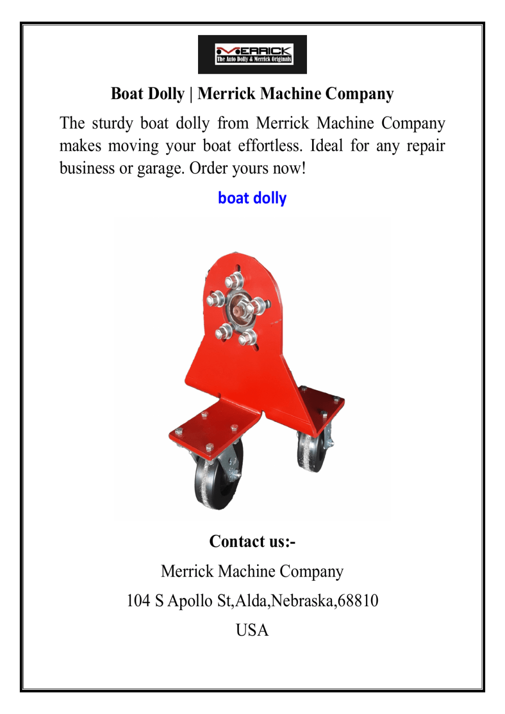 Boat Dolly | Merrick Machine Company The sturdy boat dolly from Merrick Machine Company makes moving your boat effortless. Ideal for any repair business or garage. Order yours now! boat dolly Contact us:Merrick Machine Company 104 S Apollo St,Alda,Nebraska,68810 USA