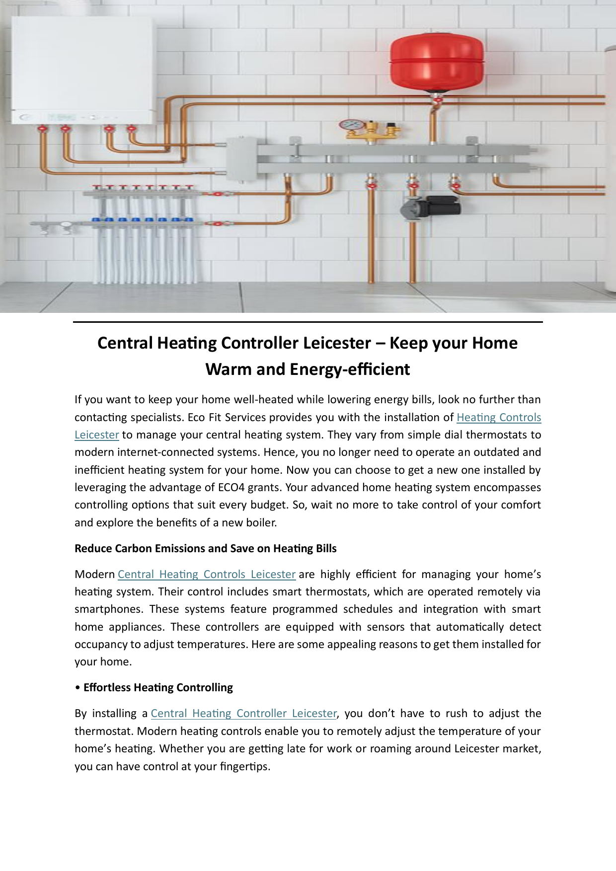 Central Heating Controller Leicester – Keep your Home Warm and Energy-efficient If you want to keep your home well-heated while lowering energy bills, look no further than contacting specialists. Eco Fit Services provides you with the installation of Heating Controls Leicester to manage your central heating system. They vary from simple dial thermostats to modern internet-connected systems. Hence, you no longer need to operate an outdated and inefficient heating system for your home. Now you can choose to get a new one installed by leveraging the advantage of ECO4 grants. Your advanced home heating system encompasses controlling options that suit every budget. So, wait no more to take control of your comfort and explore the benefits of a new boiler. Reduce Carbon Emissions and Save on Heating Bills Modern Central Heating Controls Leicester are highly efficient for managing your home’s heating system. Their control includes smart thermostats, which are operated remotely via smartphones. These systems feature programmed schedules and integration with smart home appliances. These controllers are equipped with sensors that automatically detect occupancy to adjust temperatures. Here are some appealing reasons to get them installed for your home. • Effortless Heating Controlling By installing a Central Heating Controller Leicester, you don’t have to rush to adjust the thermostat. Modern heating controls enable you to remotely adjust the temperature of your home’s heating. Whether you are getting late for work or roaming around Leicester market, you can have control at your fingertips. • Personalize your Comfort You can have personalised comfort for your home through these systems. Every room in your home might have unique heating needs. Thus, having this system installed in place allows you to create a personalised heating zone. This custom setting is specifically beneficial for older homes with varying insulation levels. • Better Energy Savings You can have the potential of substantial energy savings for your home by upgrading this system. The Central Heating Control Panel Leicester allows you to reduce electricity consumption by allowing the required rooms to heat. This brings you the advantage of lower energy bills and reduced carbon emissions. • Competent Learning Abilities Modern heating thermostats feature efficient learning capabilities that can adapt to your lifestyle. They can competently learn your heating temperature and adjustment preferences. Thus, the system can routinely adjust temperature as per your preferred home comfort. This feature is especially beneficial if you have a fixed work schedule. • Faster Weather Response Leicester Central Heating Controls are highly efficient in offering weather-responsive heating to homes. This feature is specifically beneficial for homeowners in Leicester, where the weather is unpredictable. This allows the central heating system to adapt to the sudden drop in temperature and adjust the temperature accordingly. Gain the Advantage of Heating System Installation Experts! At Eco Fit Services, we are not just a heating company to install Leicester Heating Controls. But we are your reliable partners in making the initiative of energy-efficient homes successful. We install heating systems and control panels in association with ECO4 grants available to UK homeowners. So, are you looking to make your home efficient with an upgraded heating system? If yes, look no further to reach out to us for a query and apply for the governmentbacked scheme.