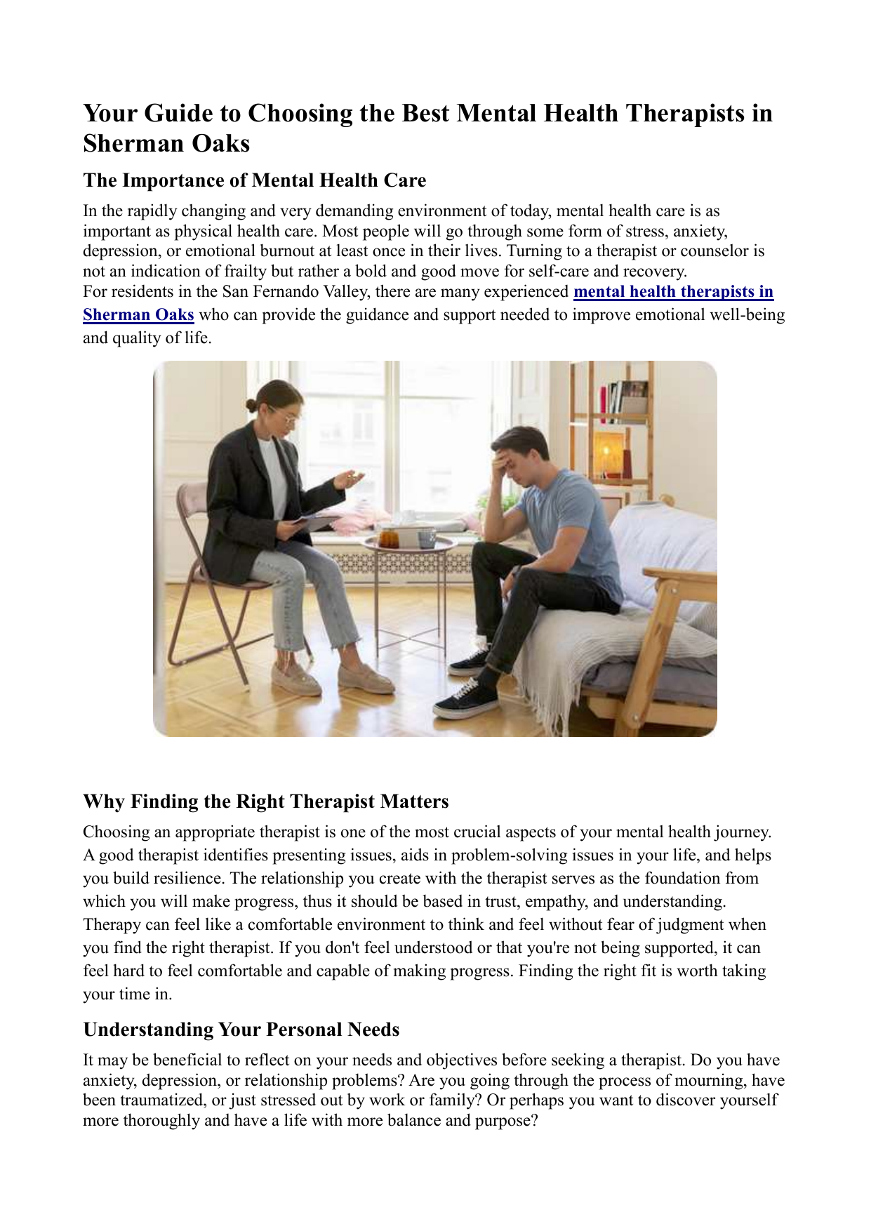 Your Guide to Choosing the Best Mental Health Therapists in Sherman Oaks The Importance of Mental Health Care In the rapidly changing and very demanding environment of today, mental health care is as important as physical health care. Most people will go through some form of stress, anxiety, depression, or emotional burnout at least once in their lives. Turning to a therapist or counselor is not an indication of frailty but rather a bold and good move for self-care and recovery. For residents in the San Fernando Valley, there are many experienced mental health therapists in Sherman Oaks who can provide the guidance and support needed to improve emotional well-being and quality of life. Why Finding the Right Therapist Matters Choosing an appropriate therapist is one of the most crucial aspects of your mental health journey. A good therapist identifies presenting issues, aids in problem-solving issues in your life, and helps you build resilience. The relationship you create with the therapist serves as the foundation from which you will make progress, thus it should be based in trust, empathy, and understanding. Therapy can feel like a comfortable environment to think and feel without fear of judgment when you find the right therapist. If you don't feel understood or that you're not being supported, it can feel hard to feel comfortable and capable of making progress. Finding the right fit is worth taking your time in. Understanding Your Personal Needs It may be beneficial to reflect on your needs and objectives before seeking a therapist. Do you have anxiety, depression, or relationship problems? Are you going through the process of mourning, have been traumatized, or just stressed out by work or family? Or perhaps you want to discover yourself more thoroughly and have a life with more balance and purpose? Knowing your priorities can make it easier to narrow down your options and find a mental health therapist in Sherman Oaks who specializes in the issues most relevant to you. The path to mental health is different for everyone. Some people are looking for short-term therapy to help them cope with a specific problem and some plan to be in therapy for an extended period and want a limited number of sessions to support their growth. Whatever your space and reason for entering, being very open about your hopes and goals will help you maximize your service. Qualifications and Experience The factor that makes it very important for a therapist to be qualified and licensed to work in California if you choose one is that they are the ones that you will rely upon for your mental health support. Licensed Marriage and Family Therapist (LMFT), Licensed Clinical Social Worker (LCSW), and Clinical Psychologist (PhD or PsyD) are among the most common credentials. The mentioned titles show that the therapist has gained through education, training, and supervision the necessary advanced skills. Experience is equally valuable. Therapists who have worked with diverse clients for several years tend to have a deeper understanding of various mental health conditions and coping strategies. Moreover, therapists in Sherman Oaks often have insight into the unique challenges faced by individuals and families in the Los Angeles area, such as high work demands, financial pressures, and maintaining a healthy work-life balance. Building a Connection and Comfort Level Absolutely the primary aspect of productive counseling is the connection feeling between the therapist and the client. The client should feel free, honored and heard. Notice the communication style of your therapist during the first few meetings. For instance, did the therapist hear you with full attention and reply wisely and in a loving way? Did he or she help you feel strong and accepted? Counseling is a teamwork effort and thus it is necessary for the client to feel like an active person involved in the process, not just there as an invisible watcher. Taking the First Step Toward Healing Choosing the right therapist may take time, but it’s one of the best investments you can make for your long-term health and happiness. Mental health therapy isn’t just about solving problems—it’s about learning to understand yourself, manage challenges, and live a more balanced, fulfilling life. If you’re ready to take that first step, start exploring mental health therapists in Sherman Oaks who align with your goals and values. Many professionals offer a brief phone consultation to help you determine whether they’re the right fit. Trust your instincts, ask questions, and remember that finding the right therapist is a journey in itself.
