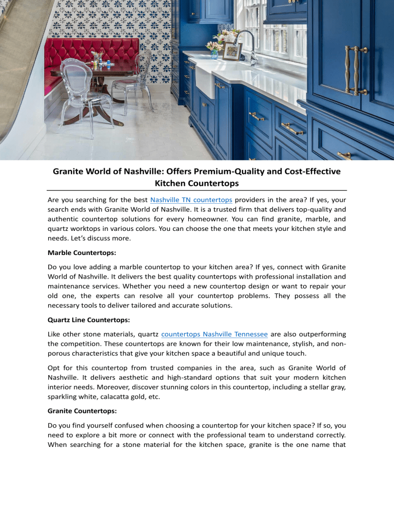 Granite World of Nashville: Offers Premium-Quality and Cost-Effective Kitchen Countertops Are you searching for the best Nashville TN countertops providers in the area? If yes, your search ends with Granite World of Nashville. It is a trusted firm that delivers top-quality and authentic countertop solutions for every homeowner. You can find granite, marble, and quartz worktops in various colors. You can choose the one that meets your kitchen style and needs. Let’s discuss more. Marble Countertops: Do you love adding a marble countertop to your kitchen area? If yes, connect with Granite World of Nashville. It delivers the best quality countertops with professional installation and maintenance services. Whether you need a new countertop design or want to repair your old one, the experts can resolve all your countertop problems. They possess all the necessary tools to deliver tailored and accurate solutions. Quartz Line Countertops: Like other stone materials, quartz countertops Nashville Tennessee are also outperforming the competition. These countertops are known for their low maintenance, stylish, and nonporous characteristics that give your kitchen space a beautiful and unique touch. Opt for this countertop from trusted companies in the area, such as Granite World of Nashville. It delivers aesthetic and high-standard options that suit your modern kitchen interior needs. Moreover, discover stunning colors in this countertop, including a stellar gray, sparkling white, calacatta gold, etc. Granite Countertops: Do you find yourself confused when choosing a countertop for your kitchen space? If so, you need to explore a bit more or connect with the professional team to understand correctly. When searching for a stone material for the kitchen space, granite is the one name that always stays at the top of the list. With its resistant and durable features, this countertop option is one of the most widely used and demanding materials. At Granite World of Nashville, you can explore a stunning color option in granite countertops. These countertops last longer than others and provide a safe and resistant-free experience. Whether you prefer the Everest white shade or something in titanium gold for your kitchen space, this company addresses all such color issues. Moreover, the experts install the countertops with compassion, care, and detailed attention, providing stress-free solutions. Granite World of Nashville is your go-to destination if you want granite countertops in Nashville TN. Visit the company for affordable, durable, and budget-friendly countertop options with expert installation and maintenance services. For more details, visit https://graniteworldnashville.com/ Original Source: https://bit.ly/48NLPZ1