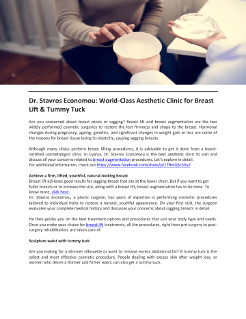 Dr. Stavros Economou: World-Class Aesthetic Clinic for Breast Lift & Tummy Tuck Are you concerned about breast ptosis or sagging? Breast lift and breast augmentation are the two widely performed cosmetic surgeries to restore the lost firmness and shape to the breast. Hormonal changes during pregnancy, ageing, genetics, and significant changes in weight gain or loss are some of the reasons for breast tissue losing its elasticity, causing sagging breasts. Although many clinics perform breast lifting procedures, it is advisable to get it done from a boardcertified cosmetologist clinic. In Cyprus, Dr. Stavros Economou is the best aesthetic clinic to visit and discuss all your concerns related to breast augmentation procedures. Let’s explore in detail. For additional information, check out https://www.facebook.com/share/p/17BmQSc3Gv/. Achieve a firm, lifted, youthful, natural-looking breast Breast lift achieves good results for sagging breast that sits at the lower chest. But if you want to get fuller breasts or to increase the size, along with a breast lift, breast augmentation has to be done. To know more, click here. Dr. Stavros Economou, a plastic surgeon, has years of expertise in performing cosmetic procedures tailored to individual traits to restore a natural, youthful appearance. On your first visit, the surgeon evaluates your complete medical history and discusses your concerns about sagging breasts in detail. He then guides you on the best treatment options and procedures that suit your body type and needs. Once you make your choice for breast lift treatments, all the procedures, right from pre-surgery to postsurgery rehabilitation, are taken care of. Sculpture waist with tummy tuck Are you looking for a slimmer silhouette or want to remove excess abdominal fat? A tummy tuck is the safest and most effective cosmetic procedure. People dealing with excess skin after weight loss, or women who desire a thinner and firmer waist, can also get a tummy tuck. Dr. Stavros Economou's clinic's cosmetic procedures have many satisfied client reviews. Book a consultation to discuss your concerns and to get the best advice from this plastic surgeon Limassol clinic.The tummy tuck procedure at this clinic focuses on removing excess abdominal fat and tightening weakened abdominal muscles. Achieving a firmer, naturally toned abdomen is possible at this clinic, boosting your self-confidence. To know more, visit here. Skin rejuvenating treatments If you're facing dullness, wrinkles, and acne marks on your face, visit Dr. Stavros Economou. Apart from cosmetic surgeries, this aesthetic clinic also provides skin rejuvenating treatments, including anti-wrinkle treatments, face lift procedures, dermal fillers, and facial rejuvenation treatments. To get more details, visit https://drseconomou.com/ Email: [email protected] Contact: 00357 25 350135 Original Source: https://bit.ly/3X8K0yy