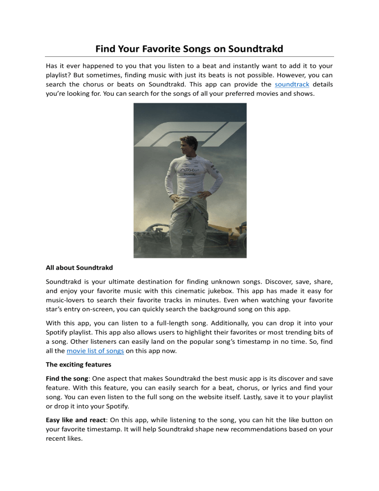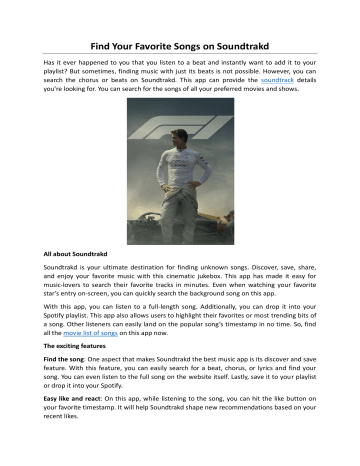 Find Your Favorite Songs on Soundtrakd Has it ever happened to you that you listen to a beat and instantly want to add it to your playlist? But sometimes, finding music with just its beats is not possible. However, you can search the chorus or beats on Soundtrakd. This app can provide the soundtrack details you’re looking for. You can search for the songs of all your preferred movies and shows. All about Soundtrakd Soundtrakd is your ultimate destination for finding unknown songs. Discover, save, share, and enjoy your favorite music with this cinematic jukebox. This app has made it easy for music-lovers to search their favorite tracks in minutes. Even when watching your favorite star’s entry on-screen, you can quickly search the background song on this app. With this app, you can listen to a full-length song. Additionally, you can drop it into your Spotify playlist. This app also allows users to highlight their favorites or most trending bits of a song. Other listeners can easily land on the popular song’s timestamp in no time. So, find all the movie list of songs on this app now. The exciting features Find the song: One aspect that makes Soundtrakd the best music app is its discover and save feature. With this feature, you can easily search for a beat, chorus, or lyrics and find your song. You can even listen to the full song on the website itself. Lastly, save it to your playlist or drop it into your Spotify. Easy like and react: On this app, while listening to the song, you can hit the like button on your favorite timestamp. It will help Soundtrakd shape new recommendations based on your recent likes. Contribute to the music community: You can easily add the scenes, moments, timestamps, or beats that moved you. It will help others to discover the exact chorus and enjoy it. They will no longer spend an extra minute typing and searching for the song. Curate and share: You can build your song collection and share it with others to hear and have a good time. The best part about choosing Soundtrakd is that it has made music browsing easier than ever. Plus, you’ll find trending songs from new movie and show releases on this app. If you cannot find a song on YouTube, you can undoubtedly find it here. So, search your preferred show list of songs and groove on the beats right away. To get more details, visit https://www.soundtrakd.com/ Original Source : https://bit.ly/3JJ3yXn
