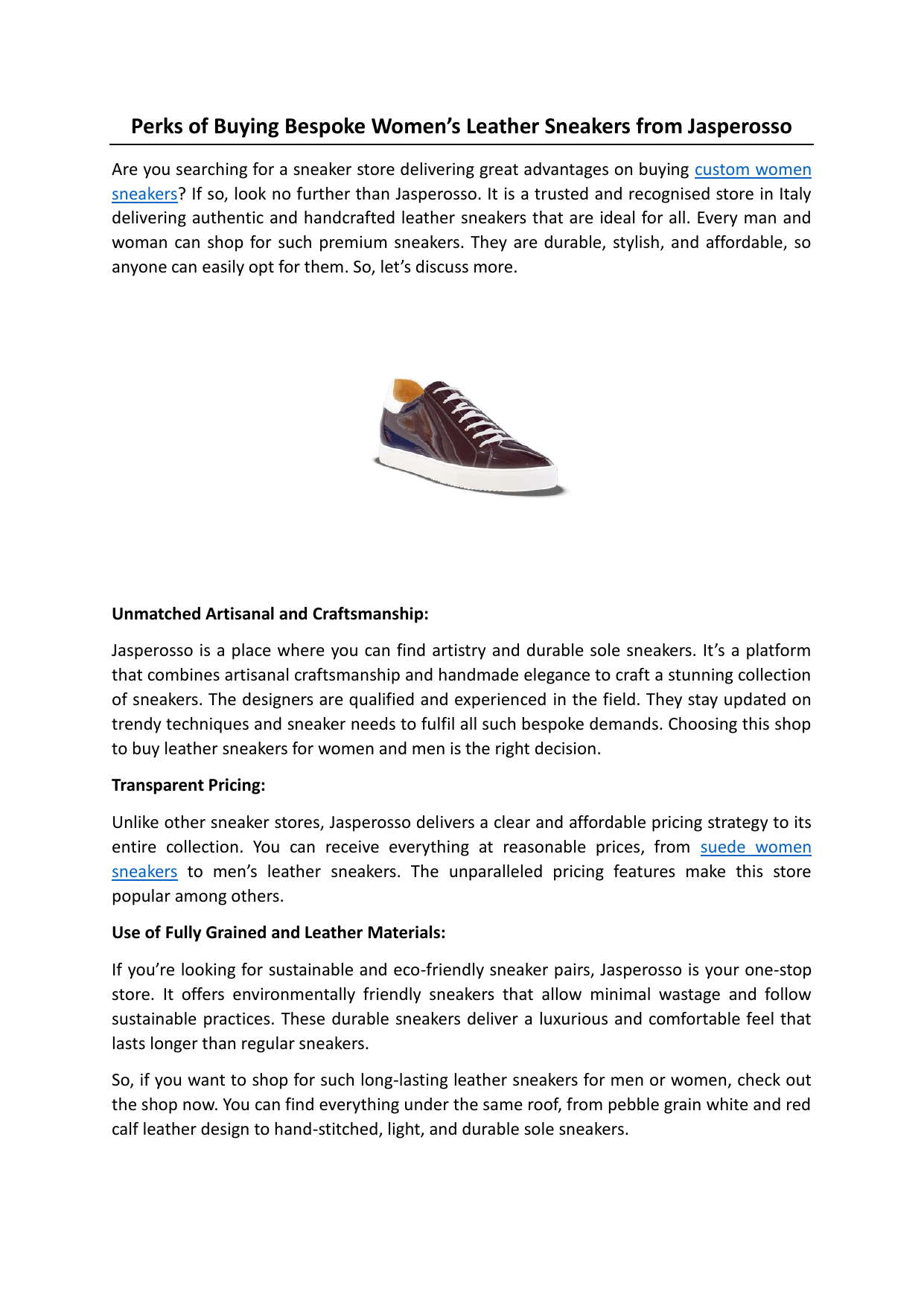 Perks of Buying Bespoke Women’s Leather Sneakers from Jasperosso Are you searching for a sneaker store delivering great advantages on buying custom women sneakers? If so, look no further than Jasperosso. It is a trusted and recognised store in Italy delivering authentic and handcrafted leather sneakers that are ideal for all. Every man and woman can shop for such premium sneakers. They are durable, stylish, and affordable, so anyone can easily opt for them. So, let’s discuss more. Unmatched Artisanal and Craftsmanship: Jasperosso is a place where you can find artistry and durable sole sneakers. It’s a platform that combines artisanal craftsmanship and handmade elegance to craft a stunning collection of sneakers. The designers are qualified and experienced in the field. They stay updated on trendy techniques and sneaker needs to fulfil all such bespoke demands. Choosing this shop to buy leather sneakers for women and men is the right decision. Transparent Pricing: Unlike other sneaker stores, Jasperosso delivers a clear and affordable pricing strategy to its entire collection. You can receive everything at reasonable prices, from suede women sneakers to men’s leather sneakers. The unparalleled pricing features make this store popular among others. Use of Fully Grained and Leather Materials: If you’re looking for sustainable and eco-friendly sneaker pairs, Jasperosso is your one-stop store. It offers environmentally friendly sneakers that allow minimal wastage and follow sustainable practices. These durable sneakers deliver a luxurious and comfortable feel that lasts longer than regular sneakers. So, if you want to shop for such long-lasting leather sneakers for men or women, check out the shop now. You can find everything under the same roof, from pebble grain white and red calf leather design to hand-stitched, light, and durable sole sneakers. Easy Return and Replacement Policies: Lastly, Jasperosso also allows an easy shipping policy. Once you order the product from this store, it will be shipped within 3-5 business days. Also, you can track your parcel. You can ask the store for a replacement if you find something damaged or broken or another product after you receive the package. The customer care executives are always there to help you in such situations. Asking them for returns, cancellations, or other queries related to the products is the best decision. So, what are you waiting for? Visit the store today and shop for premium-quality, bespoke leather sneakers for men and sleek sneakers women at competitive prices. To get more information, visit https://www.jasperosso.com/ Original Source: https://bit.ly/4opWFcy