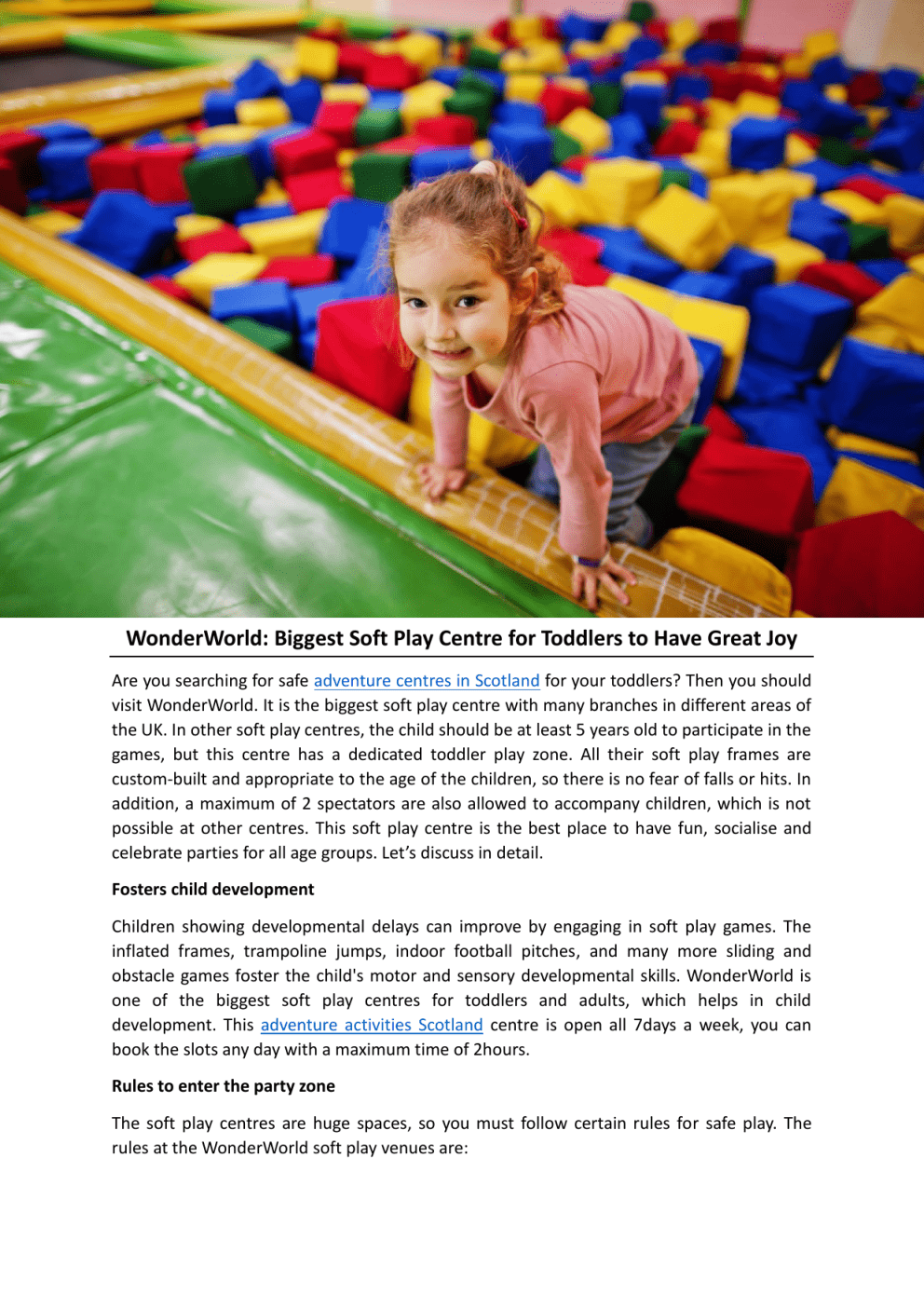 WonderWorld: Biggest Soft Play Centre for Toddlers to Have Great Joy Are you searching for safe adventure centres in Scotland for your toddlers? Then you should visit WonderWorld. It is the biggest soft play centre with many branches in different areas of the UK. In other soft play centres, the child should be at least 5 years old to participate in the games, but this centre has a dedicated toddler play zone. All their soft play frames are custom-built and appropriate to the age of the children, so there is no fear of falls or hits. In addition, a maximum of 2 spectators are also allowed to accompany children, which is not possible at other centres. This soft play centre is the best place to have fun, socialise and celebrate parties for all age groups. Let’s discuss in detail. Fosters child development Children showing developmental delays can improve by engaging in soft play games. The inflated frames, trampoline jumps, indoor football pitches, and many more sliding and obstacle games foster the child's motor and sensory developmental skills. WonderWorld is one of the biggest soft play centres for toddlers and adults, which helps in child development. This adventure activities Scotland centre is open all 7days a week, you can book the slots any day with a maximum time of 2hours. Rules to enter the party zone The soft play centres are huge spaces, so you must follow certain rules for safe play. The rules at the WonderWorld soft play venues are: Adults must always accompany children in the on-site areas. Inside the soft play areas, children and their accompanying spectators should remove their shoes and enter the play areas wearing socks. It is always best not to wear costlier and sharp objects while playing, as they may get lost in the play frames or can harm others or oneself. To avoid friction burns while sliding and crawling in soft play sports, it is advisable to avoid wearing nylon or synthetic clothes. Adults are not allowed to smoke inside the play areas. Memorable Celebrations WonderWorld soft play has a huge party hall with different themes to celebrate special occasions and birthday parties. Their party packages include 90 minutes of fun-filled play and 30 minutes of party room, served with hot and cold buffets. In addition, all attendees can enjoy unlimited cordial juices and a party bag. WonderWorld is the best plays in Glasgow for group parties and children to have great softplay time with limitless free go-kart rides. To get more information, visit https://www.wonderworldsoftplay.co.uk/ Original Source: https://bit.ly/4p5oqHu
